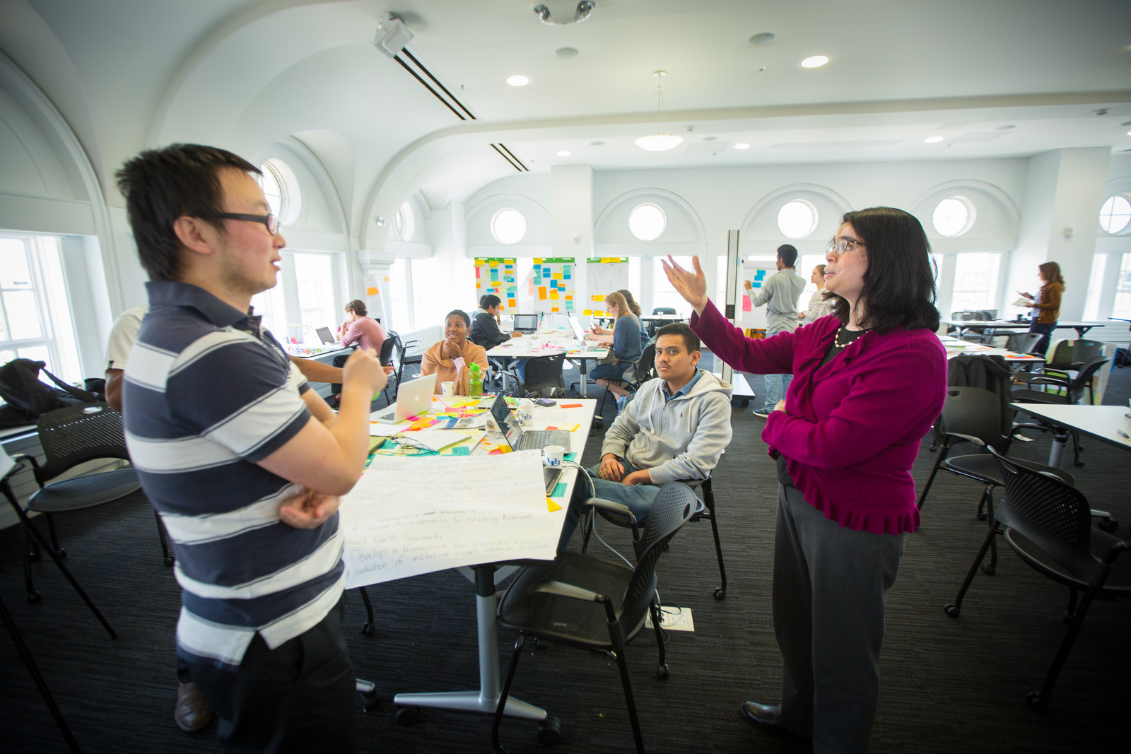 Pavani Ram, right, director of the University at Buffalo's Community for Global Health Equity, talks with students during the Global Innovation Challenge held in Hayes Hall. Photo: Douglas Levere