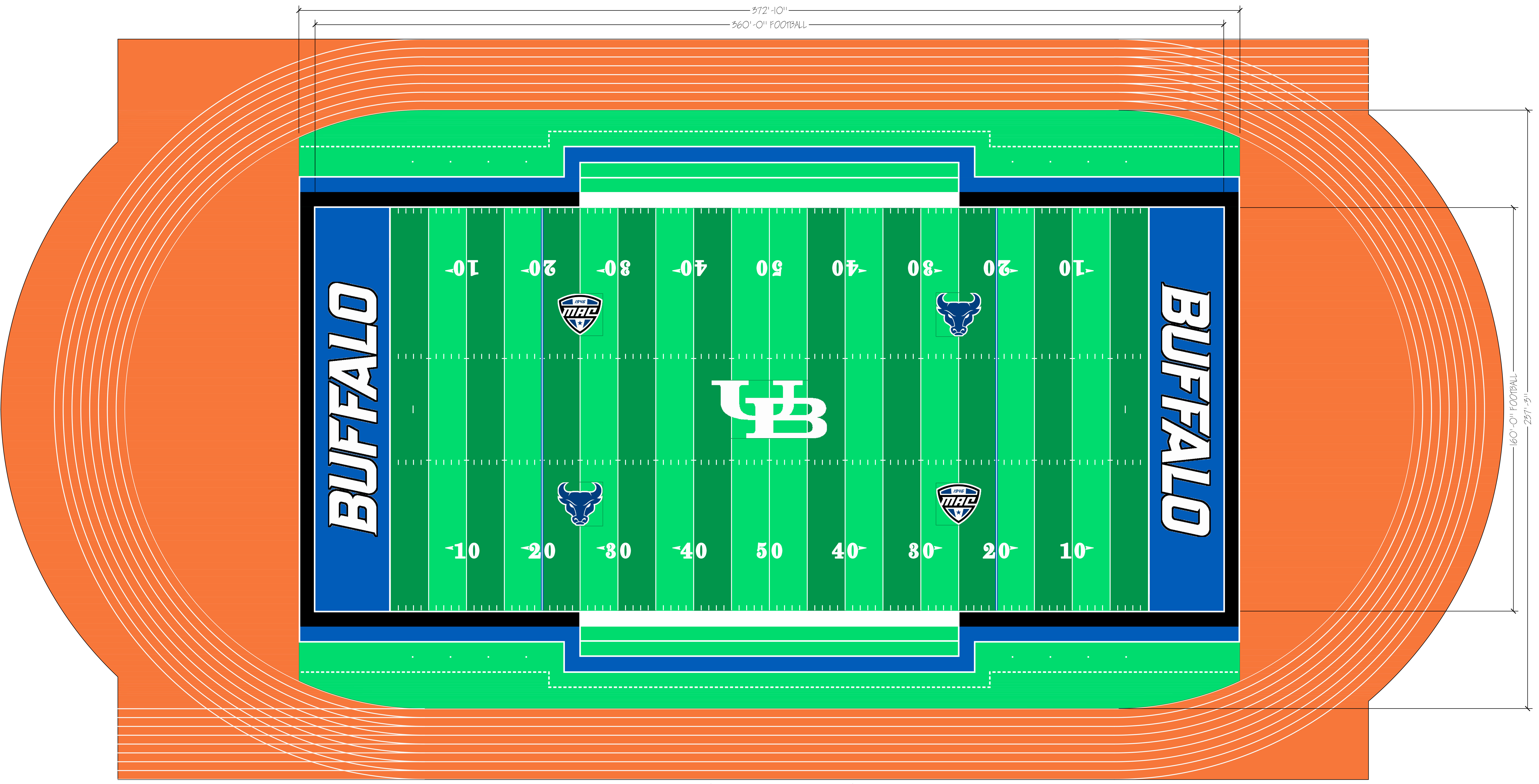 The new turf in UB Stadium will inlcude the interlocking UB at midfield and UB Athletics new wordmark "Buffalo" in the end zones, as well as the Mid-American Conference shield.