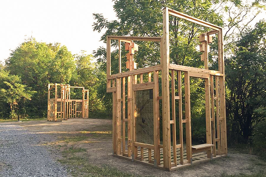 Bower — which was co-designed by Hwang and New York City-based artist Ellen Driscoll and sited along a wooded trail in Artpark in Lewiston, New York — is a series of architectural fragments that host bird nesting boxes and feature custom-designed glass “windows” composed of drawings and anti-bird-strike patterning. A bower is a leafy shelter of recess, an arbor or a rustic dwelling.
