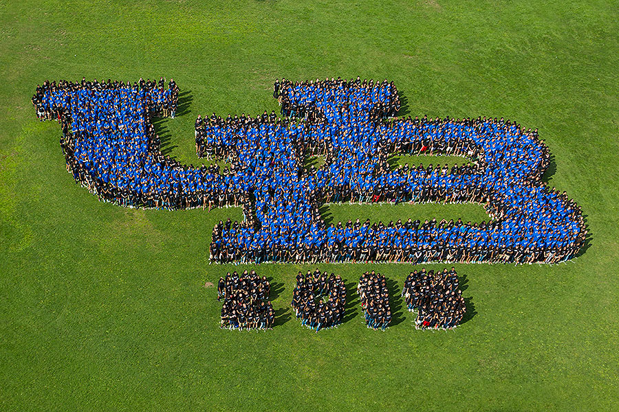 Now in its 13 consecutive year, the human logo has never been rained out and it has become a central part of the university’s Opening Weekend. Its dimensions are roughly 128 by 90 feet, which is large enough to fill nearly half of a football field.