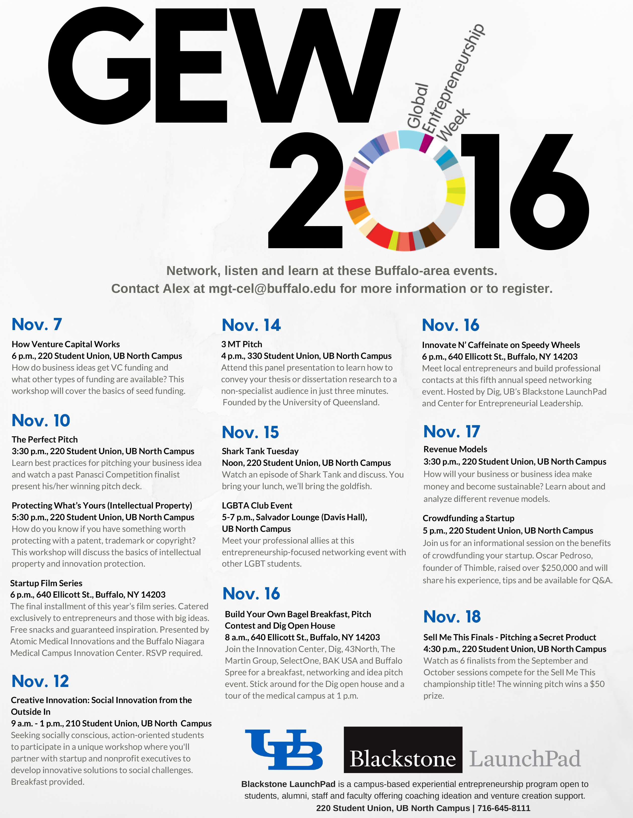 Blackstone LaunchPad at UB, a campus-based experiential entrepreneurship program, is co-hosting the Global Entrepreneurship Week events in Buffalo with partners including 43North; Atomic Medical Innovations; BAK USA; the Center for Entrepreneurial Leadership in the UB School of Management; the Buffalo Niagara Medical Campus (BNMC); Buffalo Spree; dig Buffalo; the Lesbian, Gay, Bisexual, Transgender Alliance (LGBTA) at UB; The Martin Group; SelectOne; the School of Social Work at UB; and the Thomas R. Beecher, Jr. Innovation Center on the BNMC.