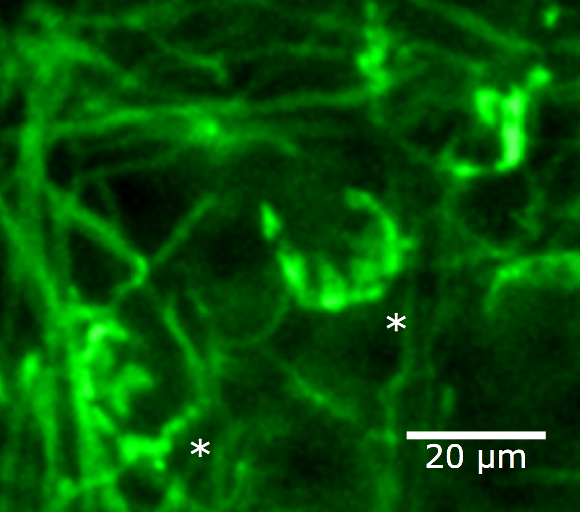 A microscope image shows nerve cells that relay information from the ear to the brain in mice. A new study shows that these cells alter their behavior and structure when the animals’ hearing is blocked. Credit: Hua Yang