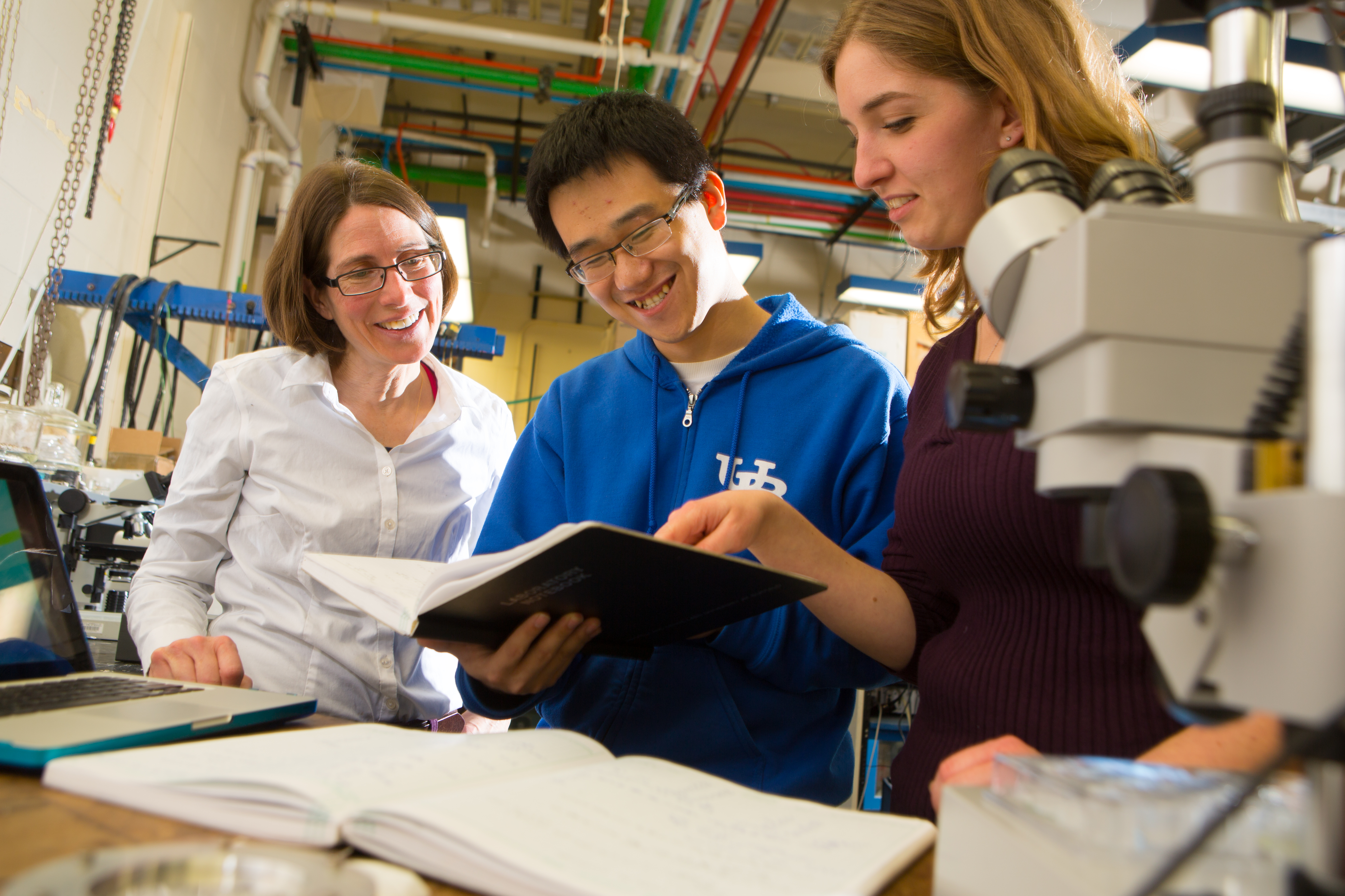 From left: Andrea Markelz, UB professor of physics, with graduate students Mengyang Xu and Katherine Niessen. Credit: Douglas Levere