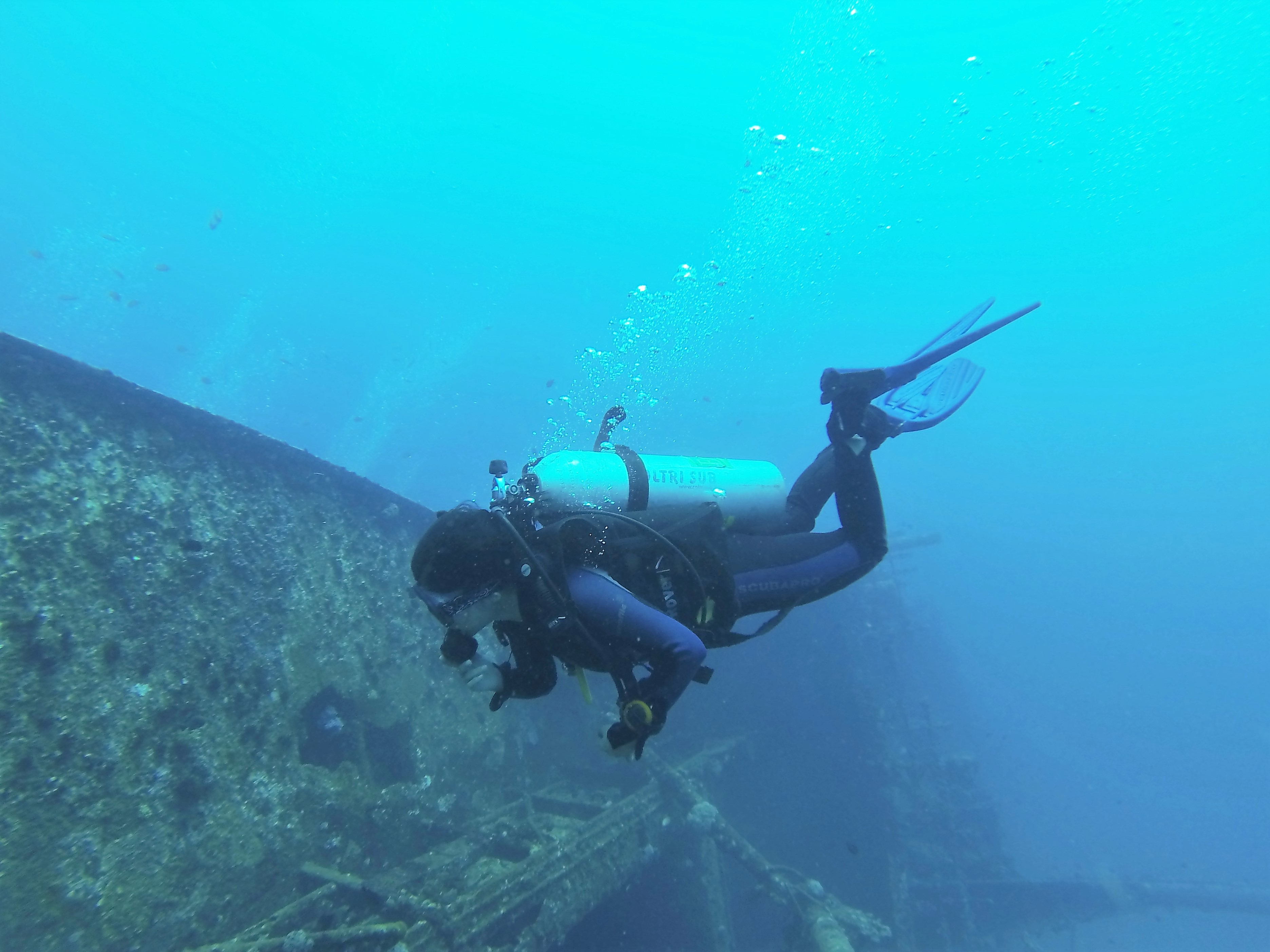 Vinisha Ranna, BDS, lead author and certified stress and rescue scuba diver, swims near underwater wreckage in Sri Lanka.