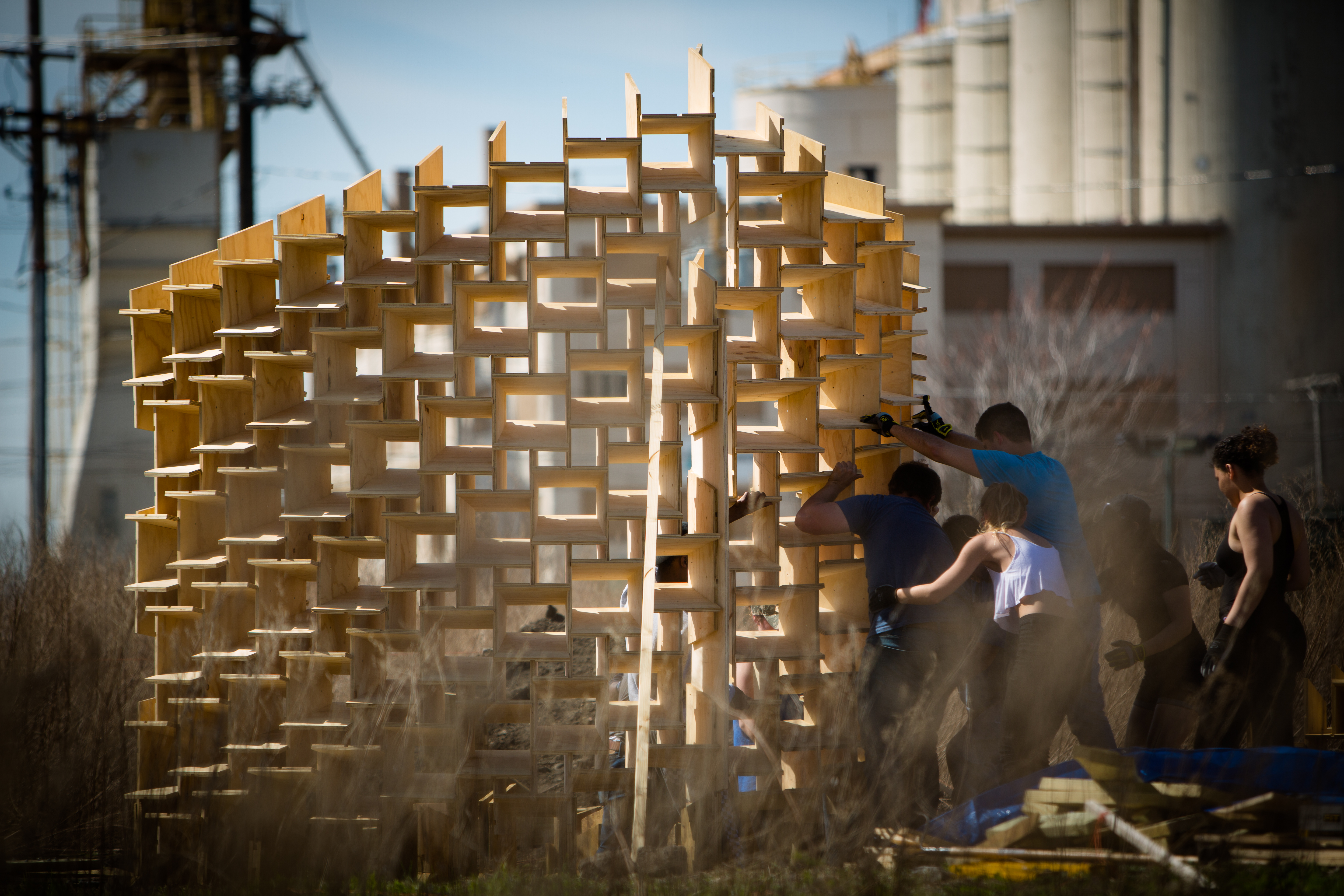 For the spring semester, Tashjian and Hume chose the 10 systems they felt had the most potential. From there, students worked in teams of 10 to 12 each to refine the designs and then piece together the larger scale structures, first in the studio in Hayes Annex and, eventually, at Silo City.
