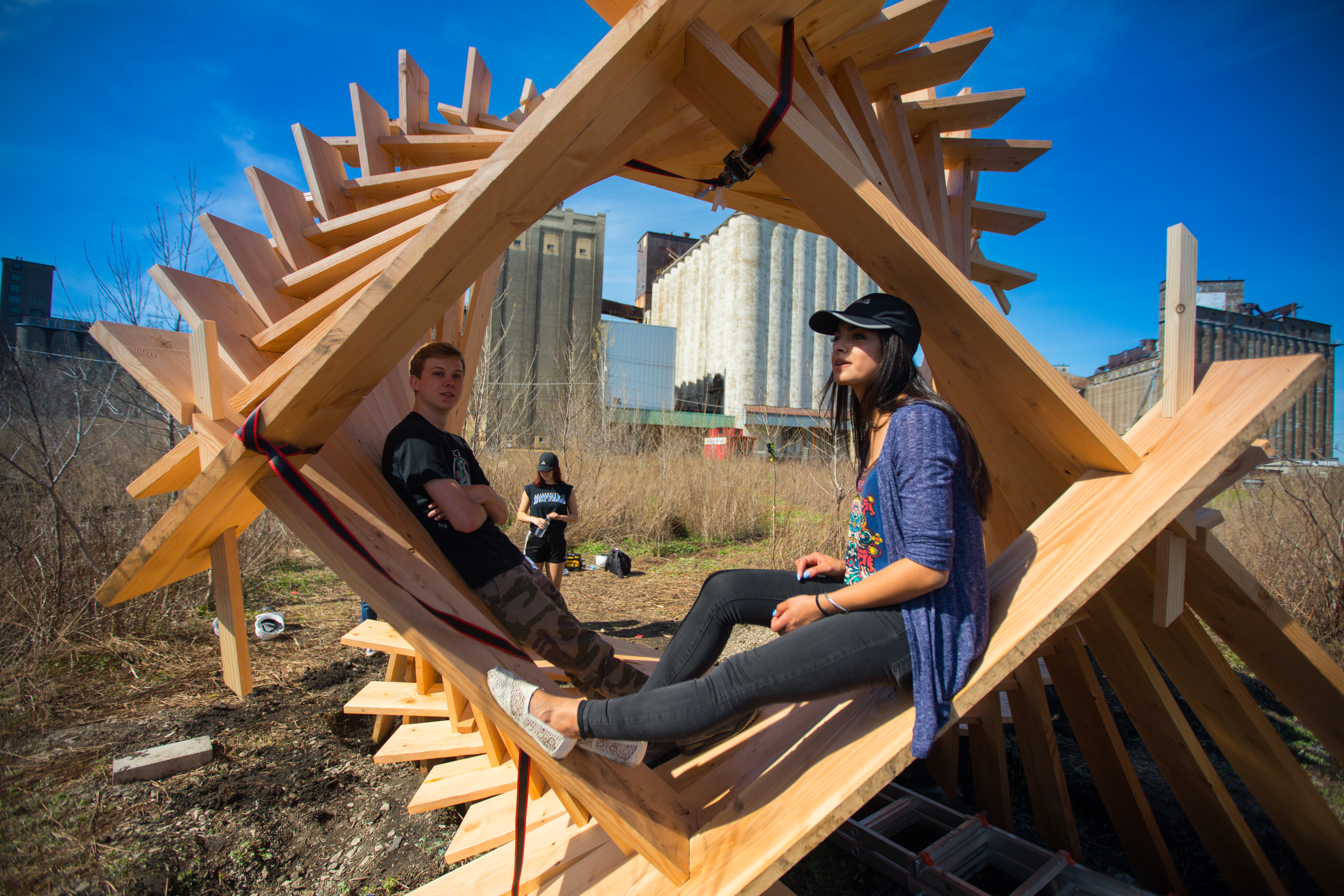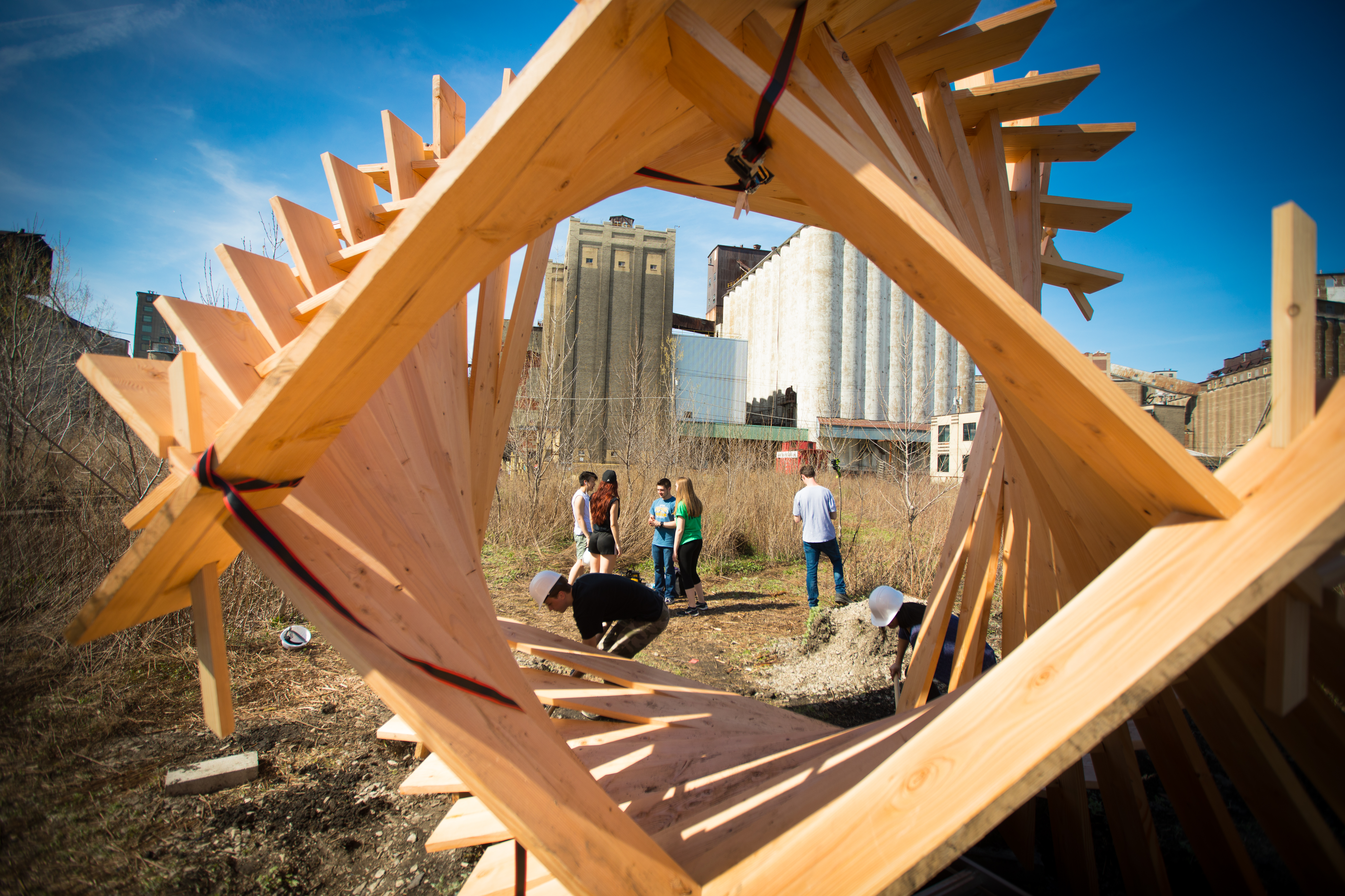 It’s called Reflection Space, and it’s a design-build project with 105 students in the freshman design studio in UB’s School of Architecture and Planning. The students worked in groups, 10 teams in all, to flesh out designs for, and then build, a collection of small structures that invite the public to experience the silos in a way they previously could not.