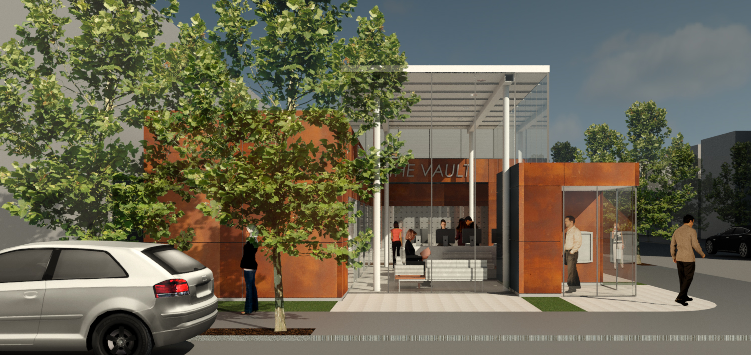 His design proposal was called ‘The Vault.” However, it lacked a significant mainstay of the traditional branch bank: a place for transactions with a teller. Instead, OBrien’s drawings focused on space for safe deposit boxes and meeting rooms for financial education seminars.