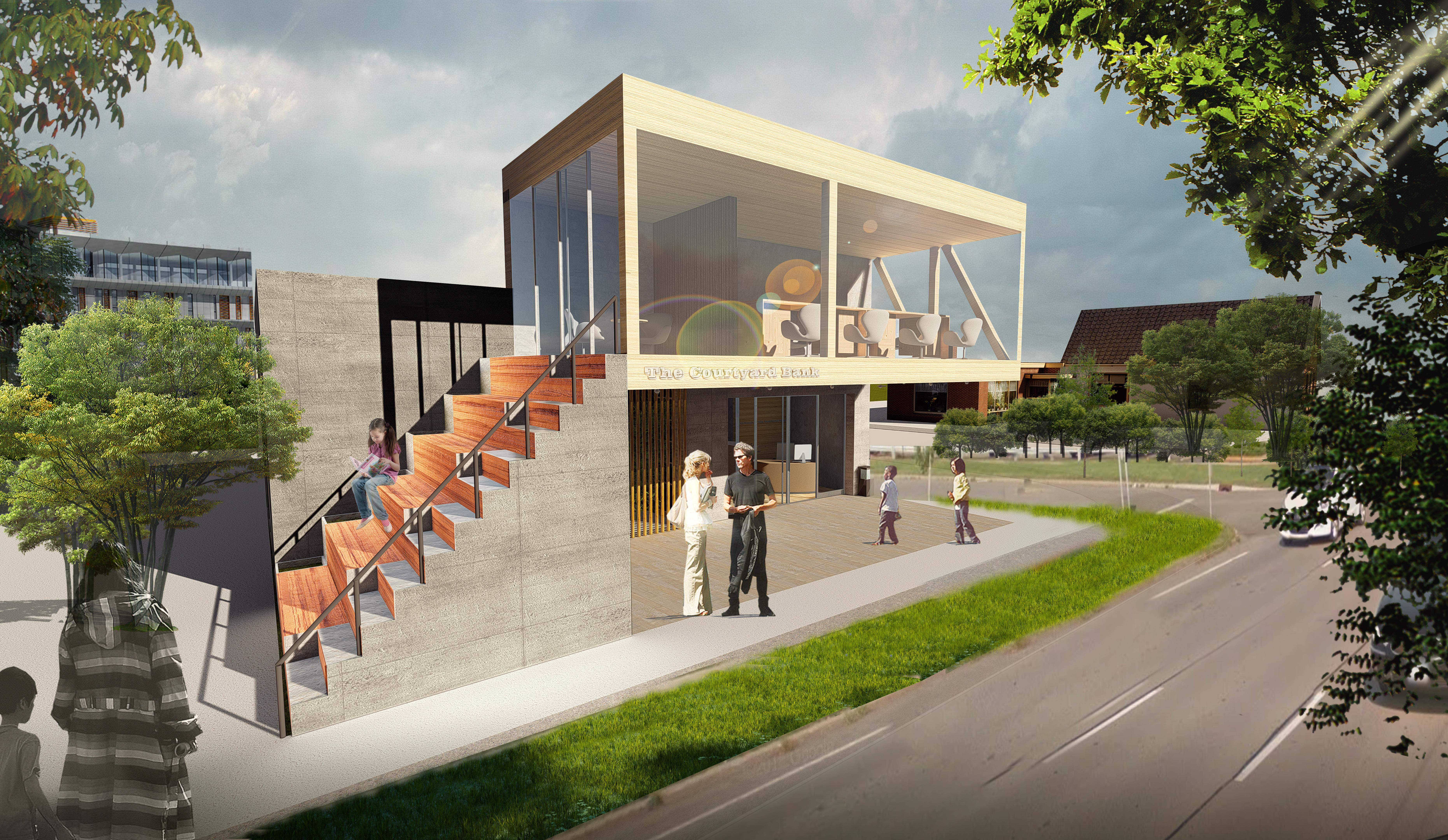 Another student, Gianfranco Pietrantoni, incorporated outdoor space that became available on the site around the smaller bank building to provide community gardens, outdoor park space or playgrounds. The bank would not be the only focus. Inside the building would be a café and community meeting space.