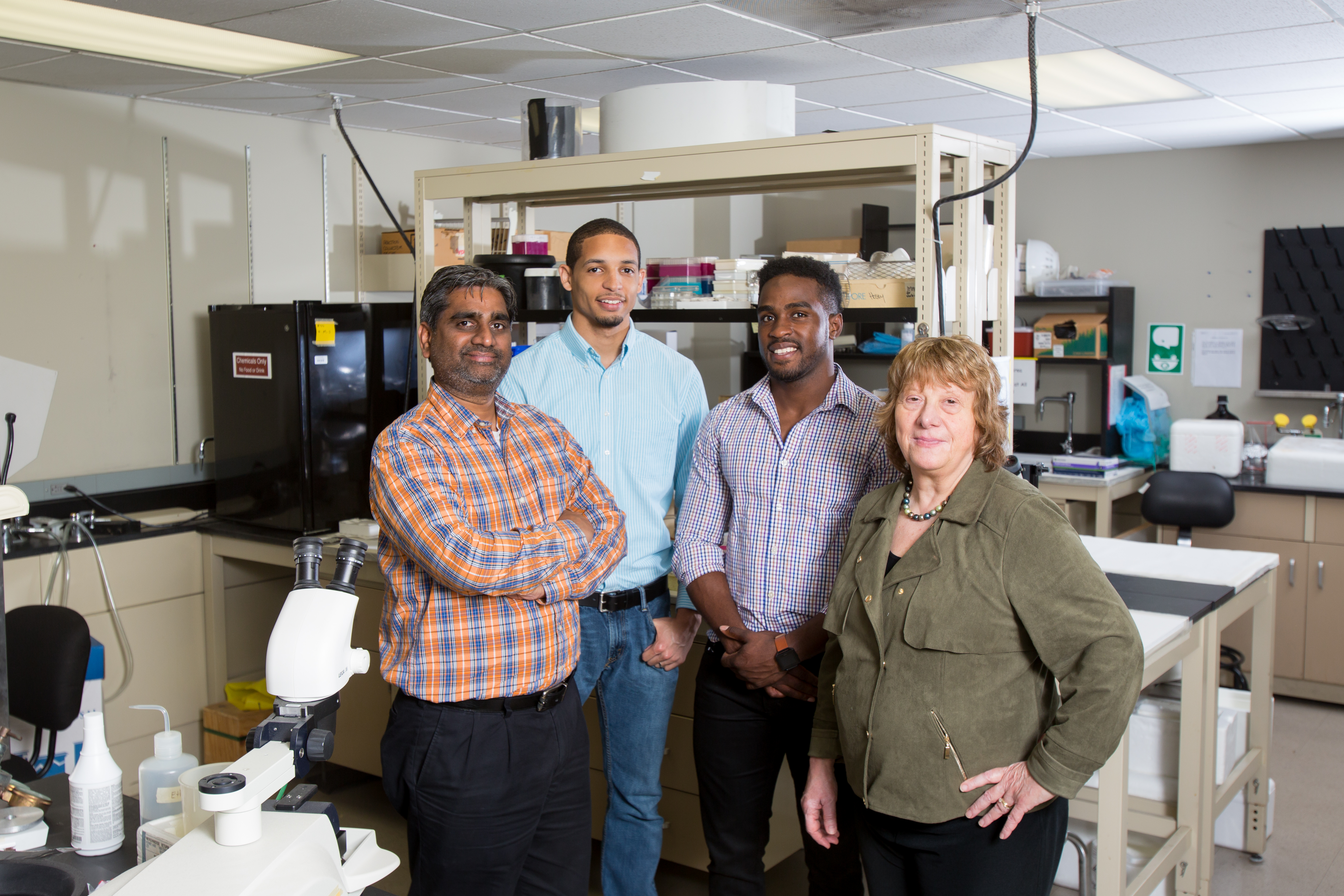 From left to right, Rajendram Rajnarayanan, students Anthony Jones and Kerri Pryce, and Margarita L. Dubocovich, in a lab in Farber Hall. Credit: Meredith Forrest Kulwicki.