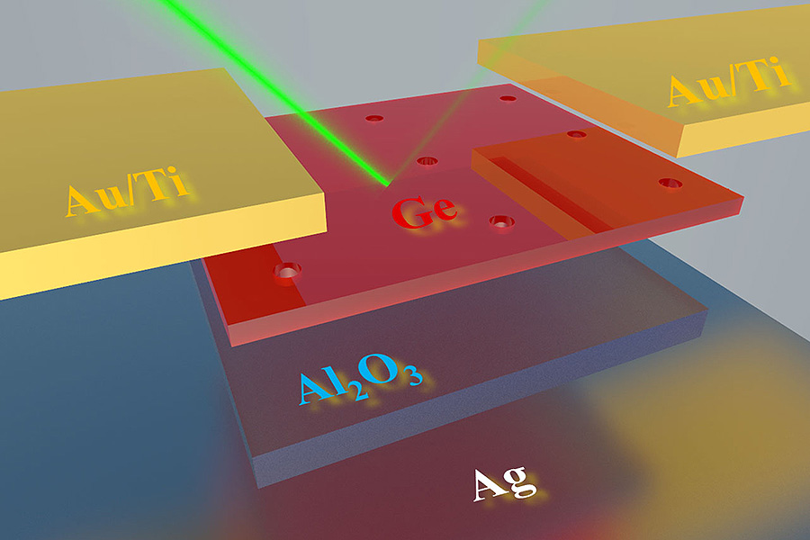The new device is an advancement of Gan’s work developing nanocavities that increase the amount of light that thin semiconducting materials like germanium can absorb. It consists of nanocavities sandwiched between a top layer of ultrathin single-crystal germanium and a bottom, reflecting layer of silver.