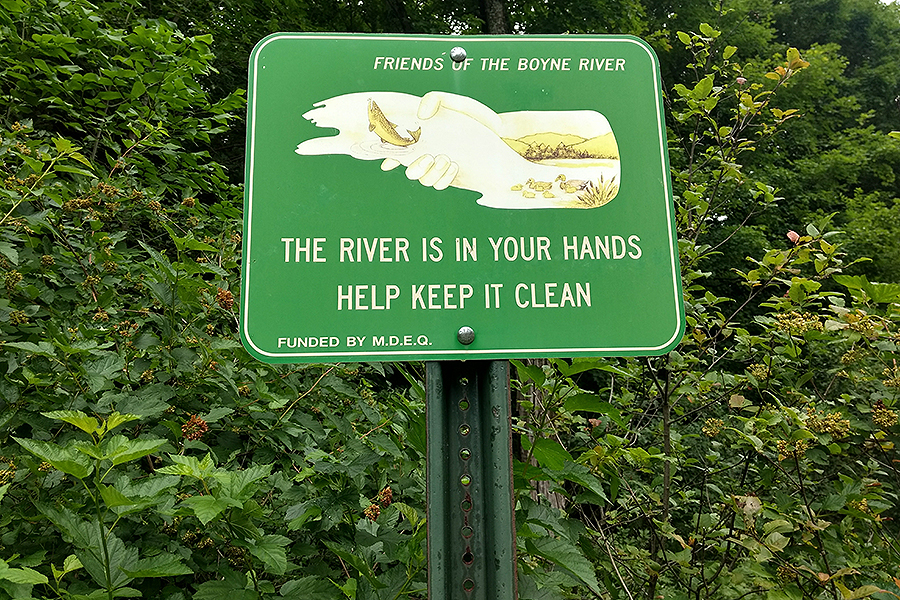 A sign on the Boyne River provides information on how passersby can contribute to a research project that uses crowdsourced data to help monitor river conditions. Credit: Damon Hall