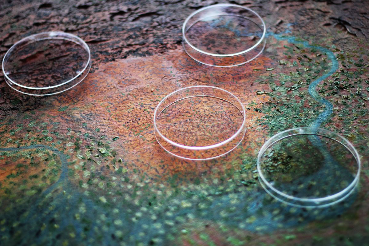 Umwelt Microbiana is an interactive installation that seeks to understand the complex and fragile networks, communication and gene transfer between microbes in the air, water, earth and skin using samples collected locally.