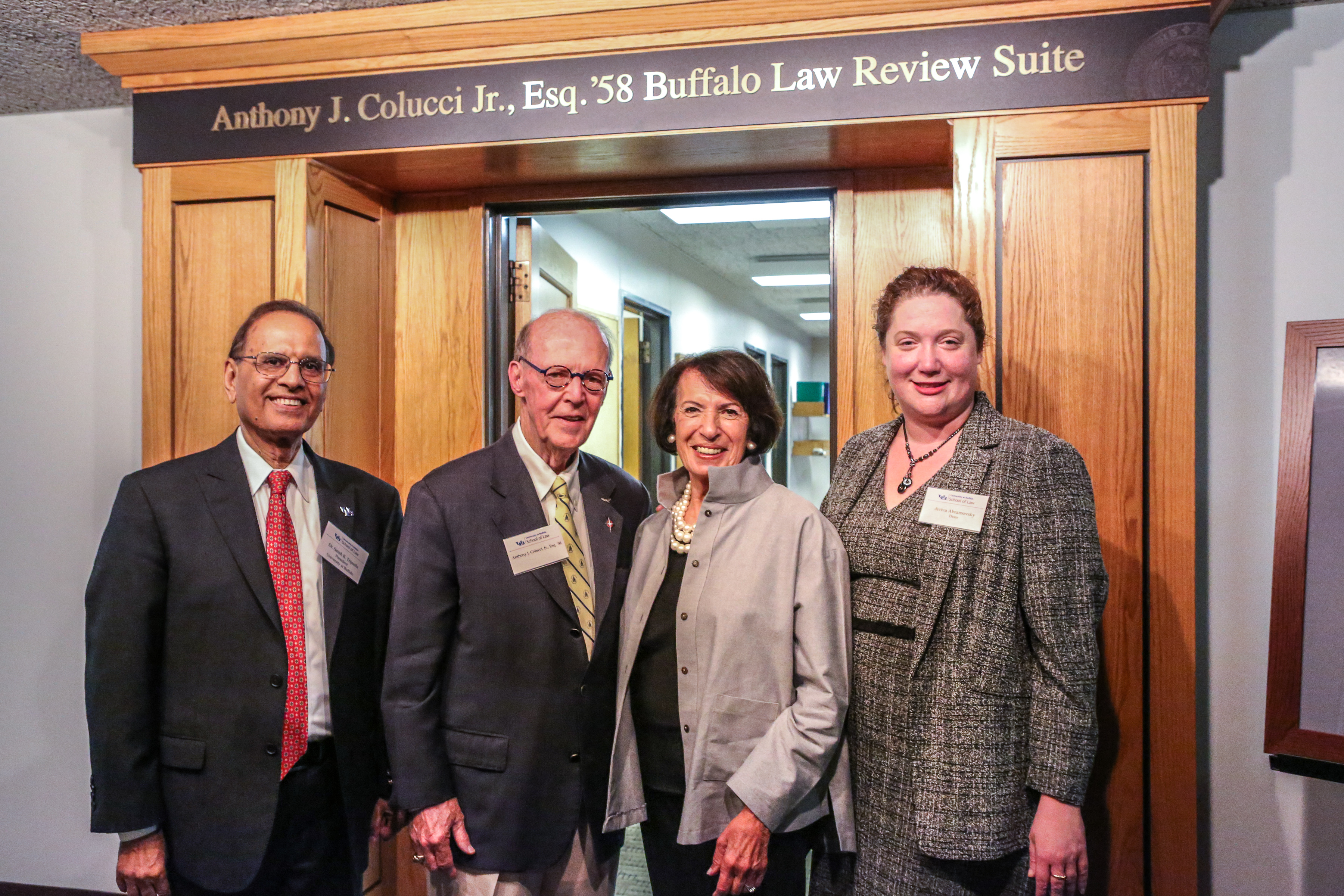 UB President Satish K. Tripathi, Anthony J. Colucci Jr., Carmela Colluci and UB School of Law Dean Aviva Abramovsky.