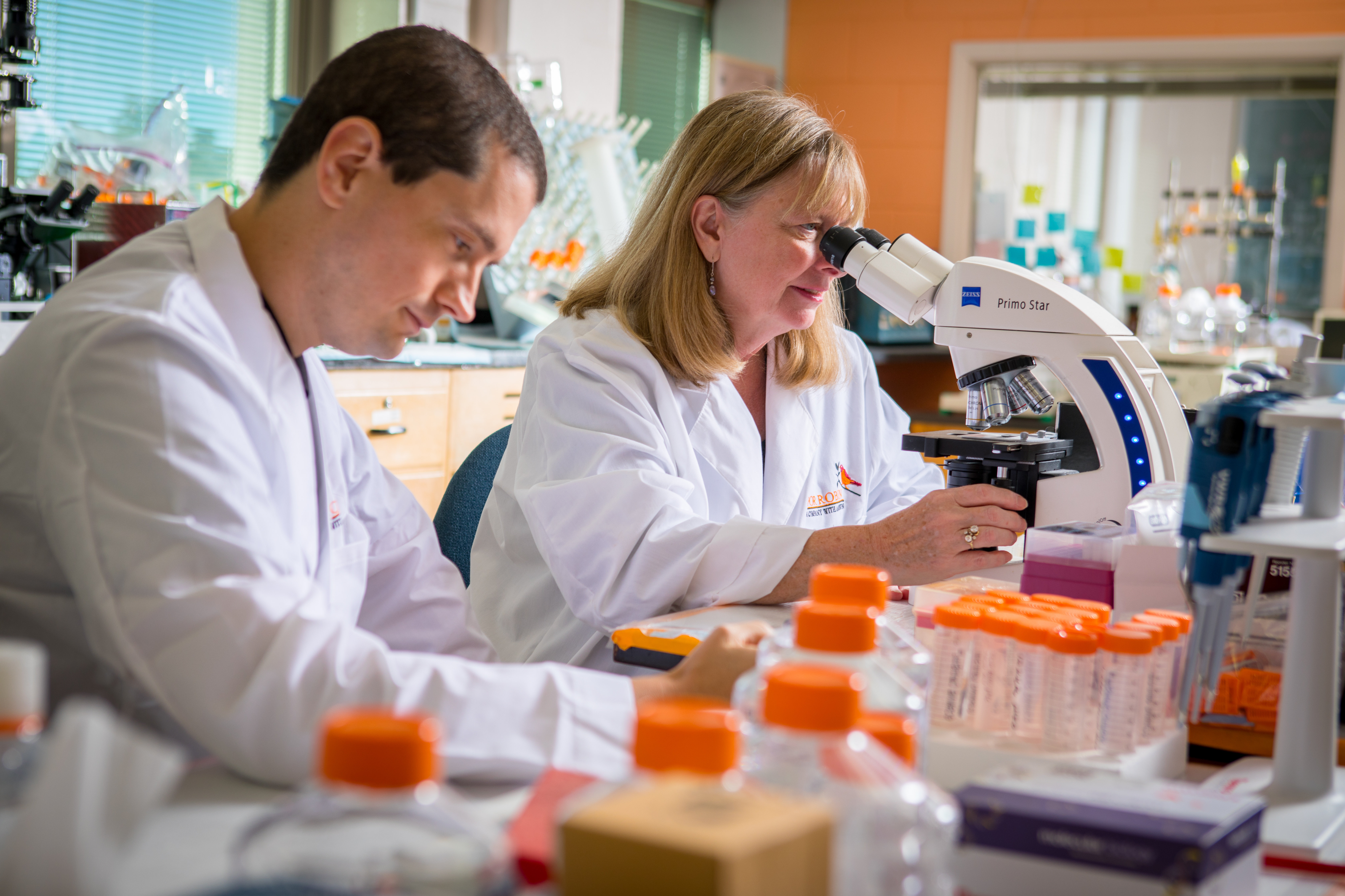 Kate Rittenhouse-Olson (right) with company senior scientist John Fisk in a laboratory setting.