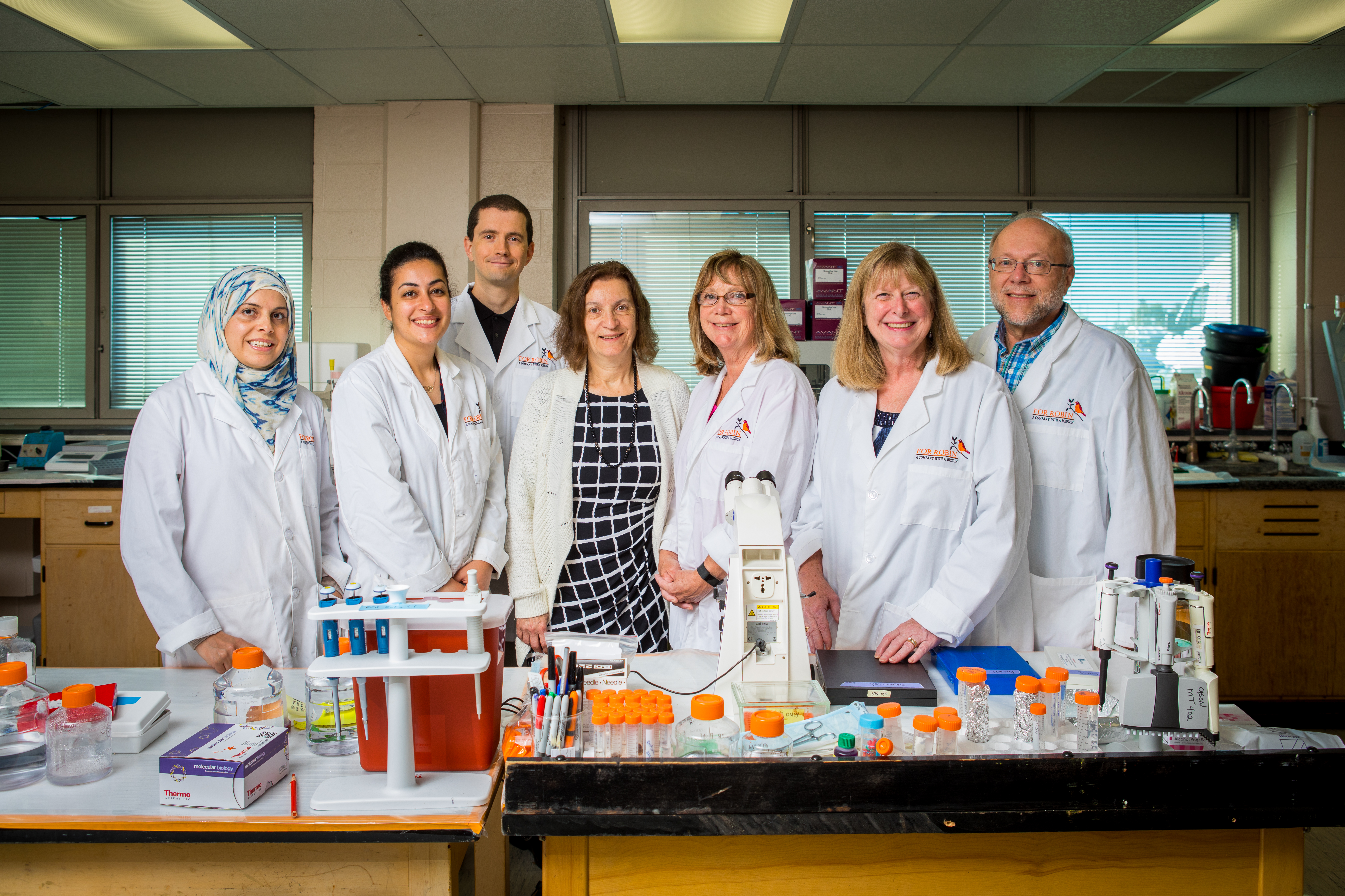 For-Robin President and Founder Kate Rittenhouse-Olson, second from right, with For-Robin team members. From left to right: Diala Ghazal, Fatma Zalzala, John Fisk, Sally Quataert, Susan Morey and James Olson. Credit: Douglas Levere/University at Buffalo