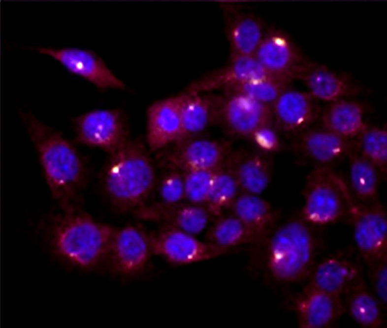 Mouse cancer cells under a microscope. The bright whitish dots show where For-Robin's humanized antibody has penetrated the cells. The antibody is also capable of penetrating and killing human tumor cells. Credit: Loukia Karacosta/For-Robin Inc.