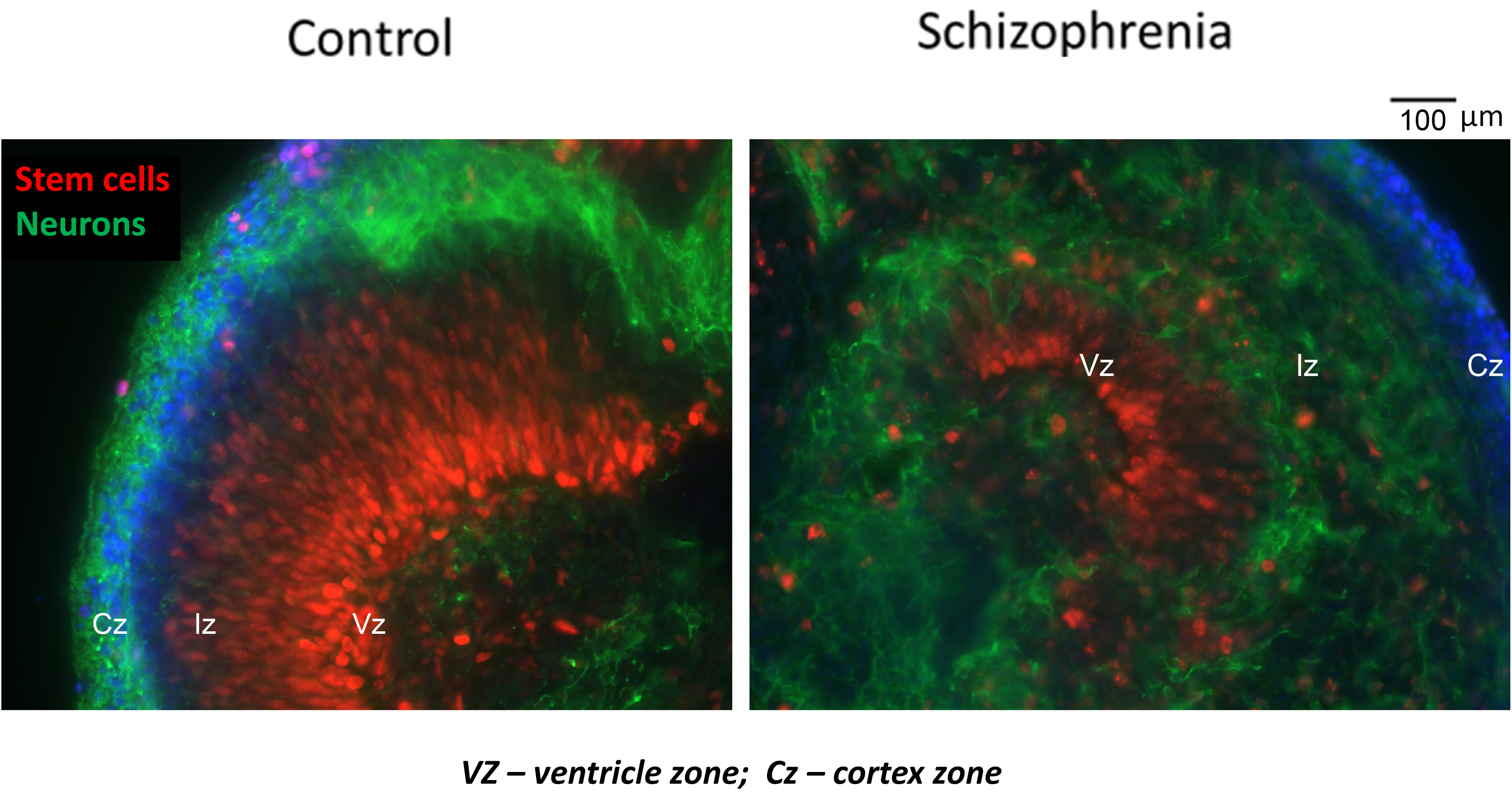 In cerebral organoids generated from stem cells of patients with schizophrenia, (image on the right), disruption in the layers of stem cell (red) surrounding the brain-like ventricles was evident as early as two weeks into the development of the organoids – roughly comparable to the first trimester of pregnancy. Formation of neurons (green) is clearly impaired compared to the control figure. Photo: M. Stachowiak, Creative Commons; image legend was removed from original.