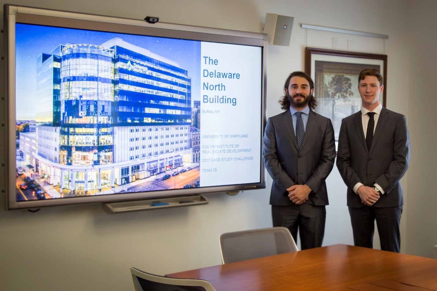 University at Buffalo real estate development master's students Christopher Tringali and Kevin Turner won first place in the University of Maryland's 2017 Colvin Case Study Challenge for their review of the new Delaware North headquarters in Buffalo.