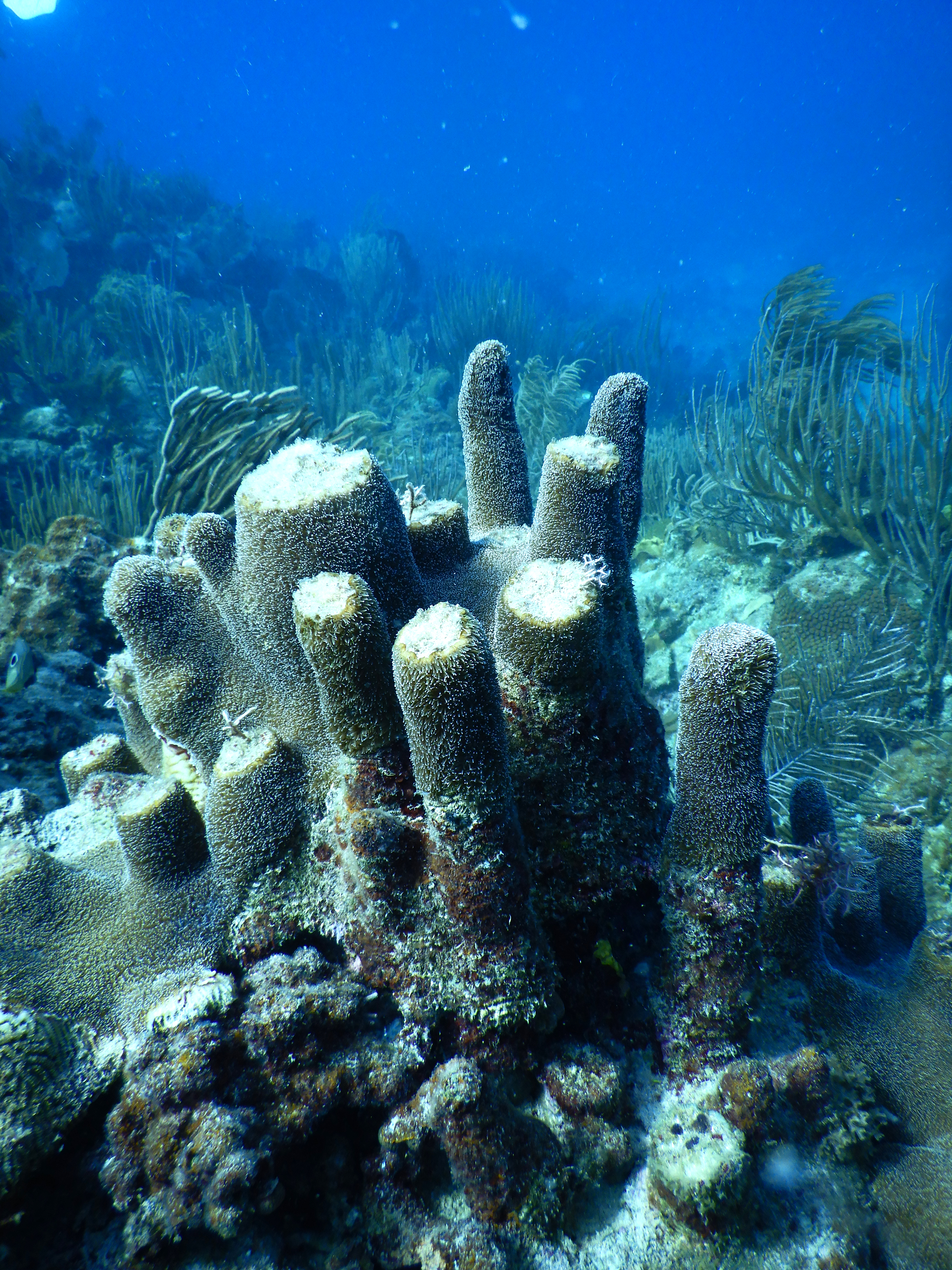 A damaged pillar coral on a reef off the coast of St. John, U.S. Virgin Islands. The tops of some of the pillars have broken off as a result of the recent hurricanes. Credit: Howard Lasker