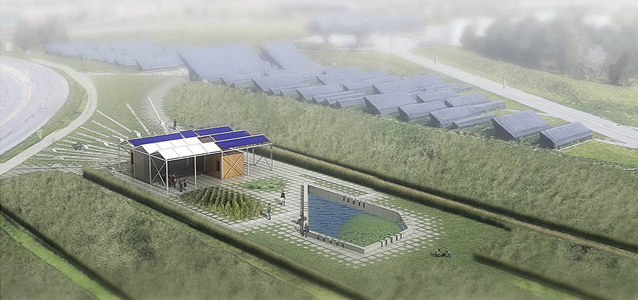 McCabe’s plan converts the land surrounding the Solar Strand into a more park-like environment that will encourage people to learn about sustainable energy, stormwater and food production through the examples of the site, the house and the Solar Strand.