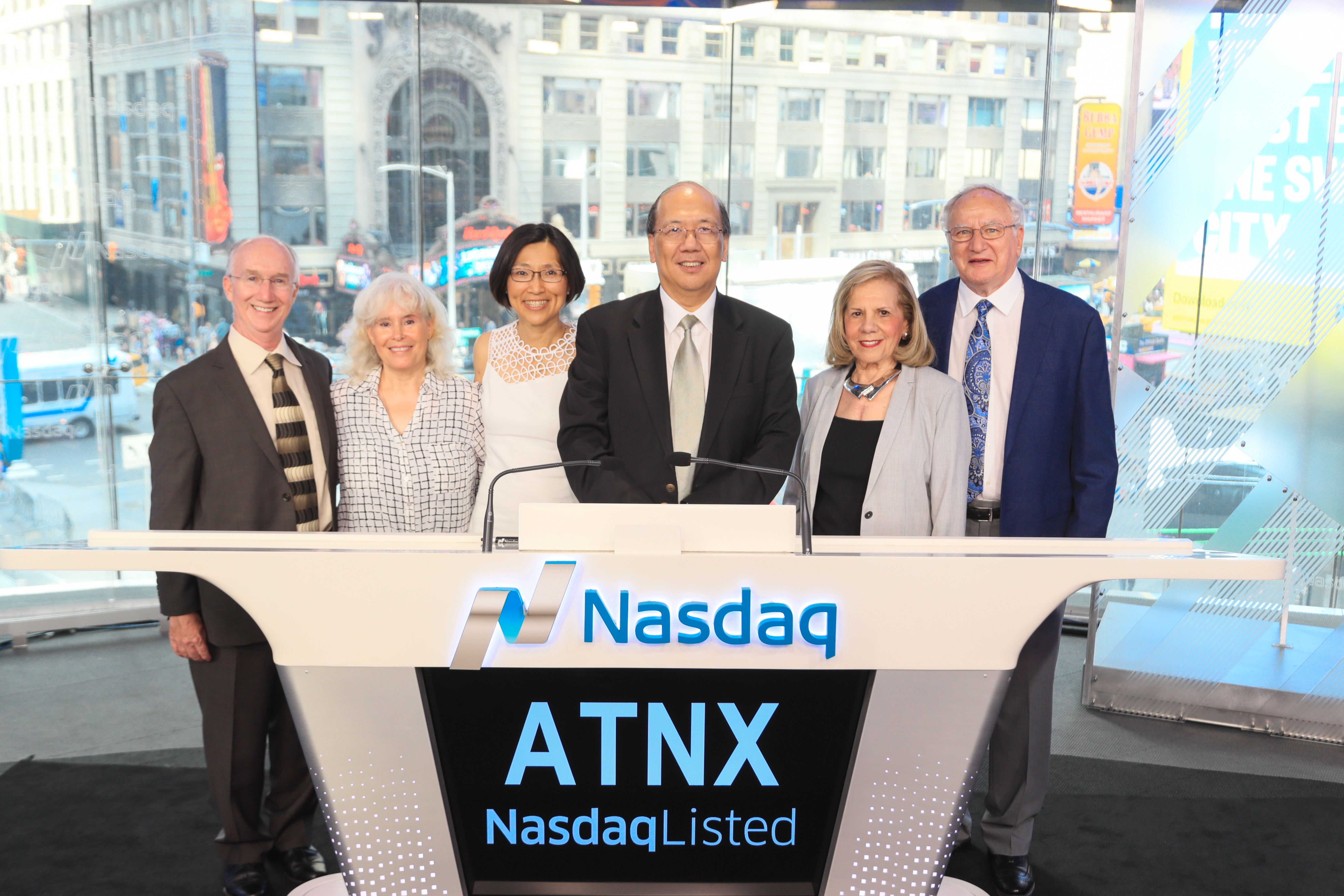Athenex co-founders David Hangauer (far left), Johnson Lau (center, above microphones), and Allen Barnett (far right), pictured with their wives, at the Nasdaq exchange. Credit: Photography by Christopher Galluzzo/Nasdaq Inc.