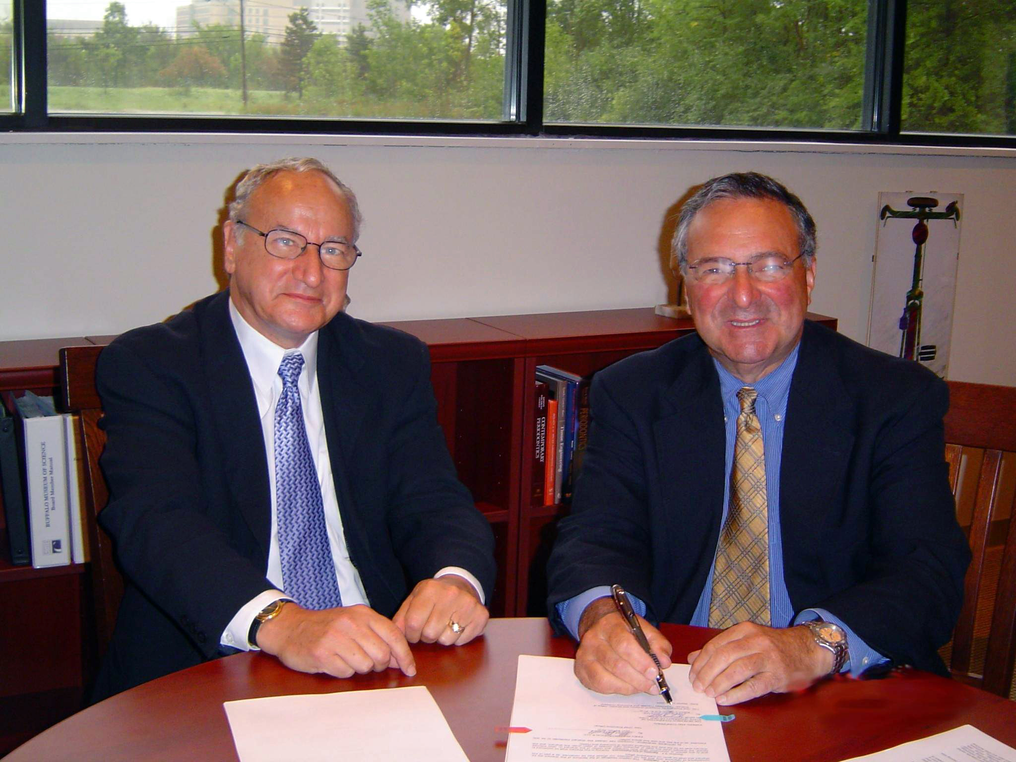 Athenex co-founder Allen Barnett, left, and UB's Robert Genco, who oversaw technology transfer for the university, signing the deal that allowed Athenex to license discoveries made in the lab of UB researcher and Athenex co-founder David Hangauer.