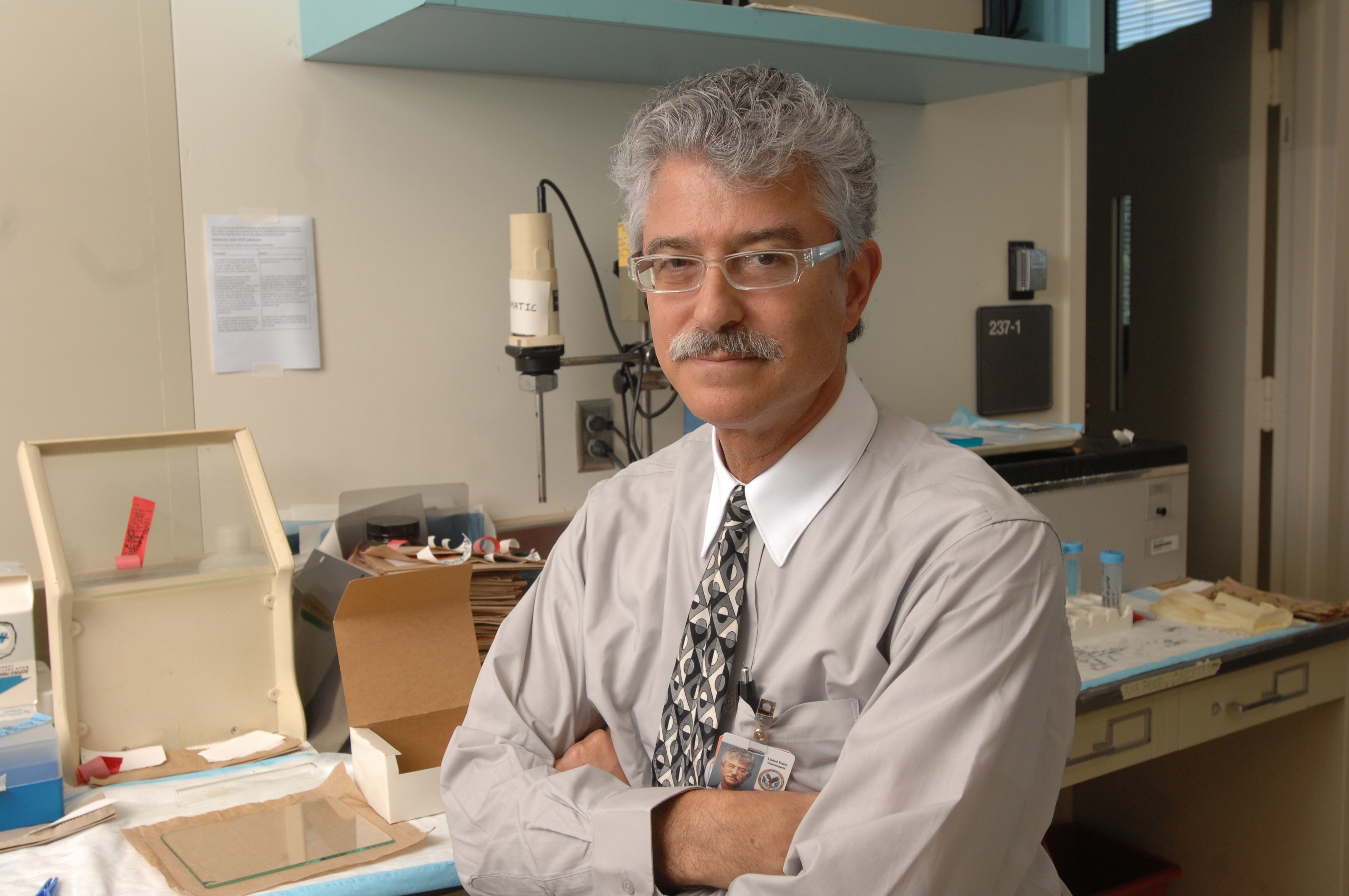 Steven Fliesler standing in shirt and tie with arms folded in lab.