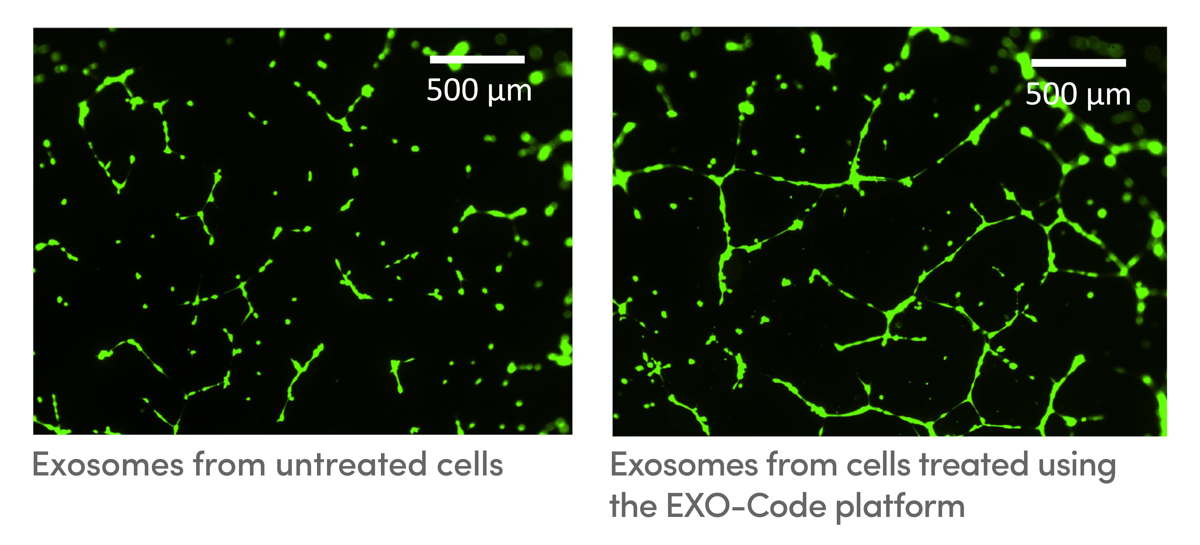 Exosomes are tiny, pouch-like vesicles that are secreted by cells and that could be used as tools for delivering drugs and treating disease. In this image series, UB researchers used a novel technology called the EXO-CODE platform to engineer exosomes (right) with the ability to form more capillary-like structures in endothelial cells than unmodified exosomes (left). The capillary-like structures promote development of new blood vessels, which is important for tissue regeneration. This is one example of how the EXO-CODE platform can be used to tailor exosomes for a wide variety of uses. Credit: Therapeutic Biomaterials Lab at the University at Buffalo
