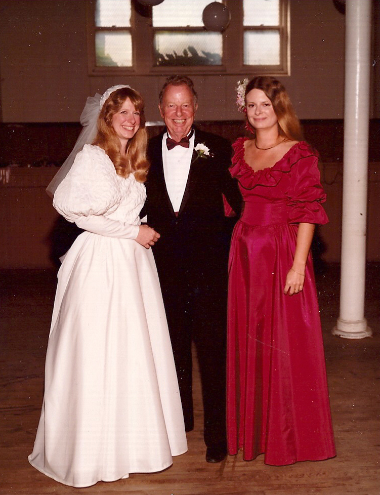 Kate Rittenhouse-Olson, left, on her wedding day in 1984, with her father, George Rittenhouse (center), and her sister, Robin Quataert (in red). Rittenhouse-Olson named her cancer pharmaceutical firm, For-Robin, after her sibling, who died of breast cancer in 1986.