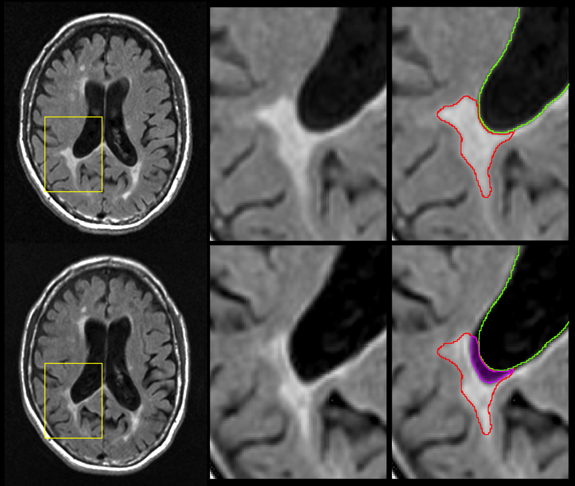 Representative example of an atrophied ("disintegrating") lesion. Top row shows baseline MRI images, and bottom row shows follow-up MRI images. The magenta region in the bottom right panel shows the part of the original lesion (top) that has disintegrated into cerebrospinal fluid over the intervening period. Nearly 20% of the lesion was lost over time. (Image: Michael G. Dwyer)
