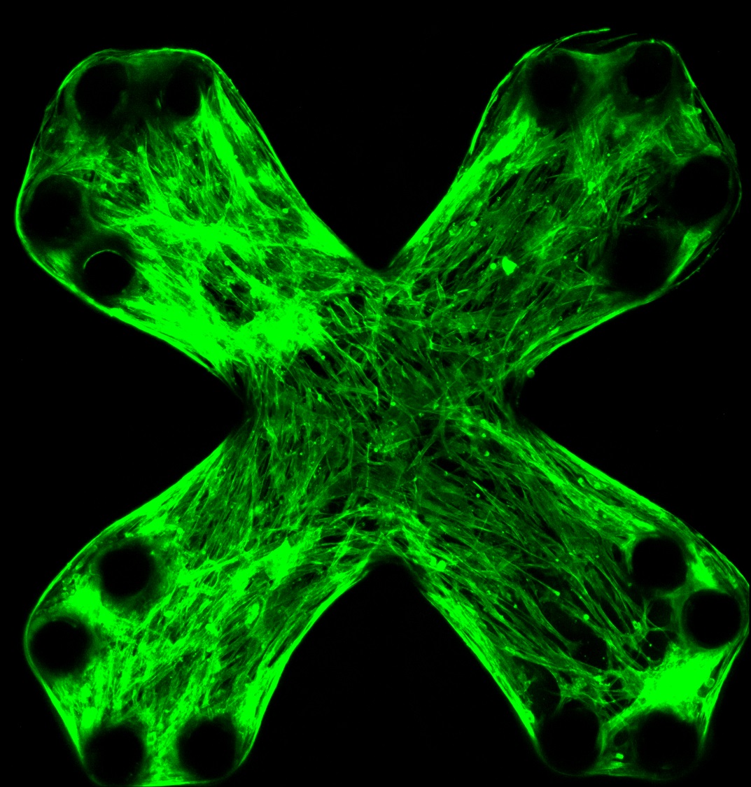 The tissue contraction causes the flexible pillars to bend, allowing researchers to calculate the tissue contraction force based on simple mechanical principles.