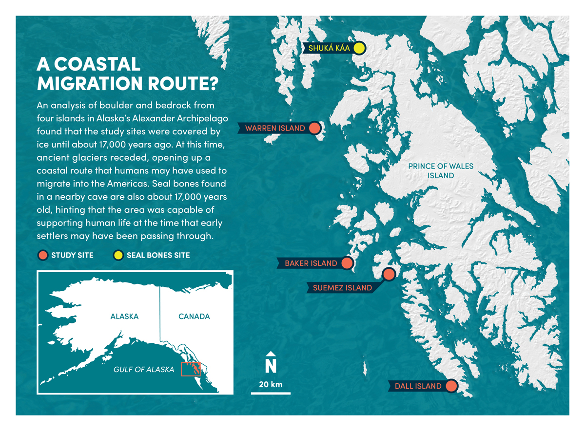 By analyzing boulders and bedrock, a research team led by the University at Buffalo shows that part of a coastal migration route became accessible to humans 17,000 years ago. During this period, ancient glaciers receded, exposing islands of southern Alaska’s Alexander Archipelago to air and sun — and, possibly, to human migration.