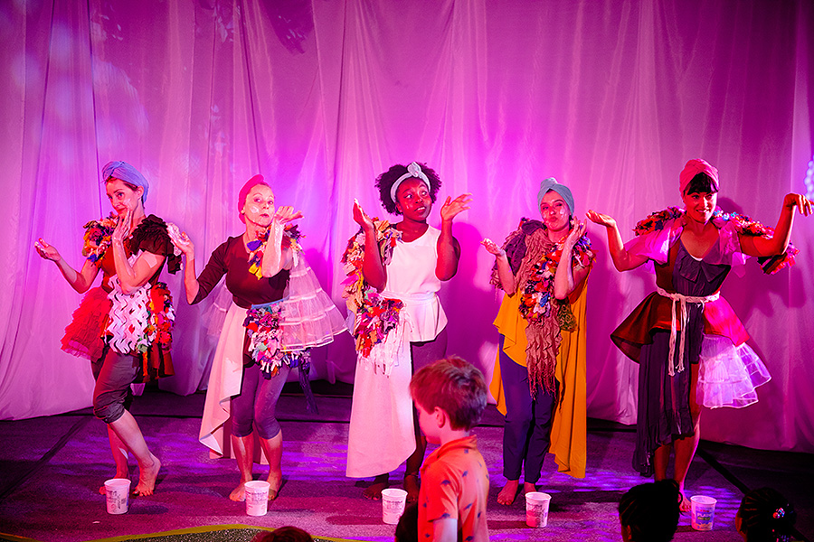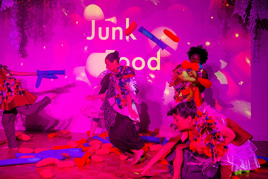 Dancers performing with bacteria “balls” in exploration of homeostasis. Left to right: Stephani Foraker, Alexia Buono, Brooke Laura and Courtney Barrow. Photo: Douglas Levere