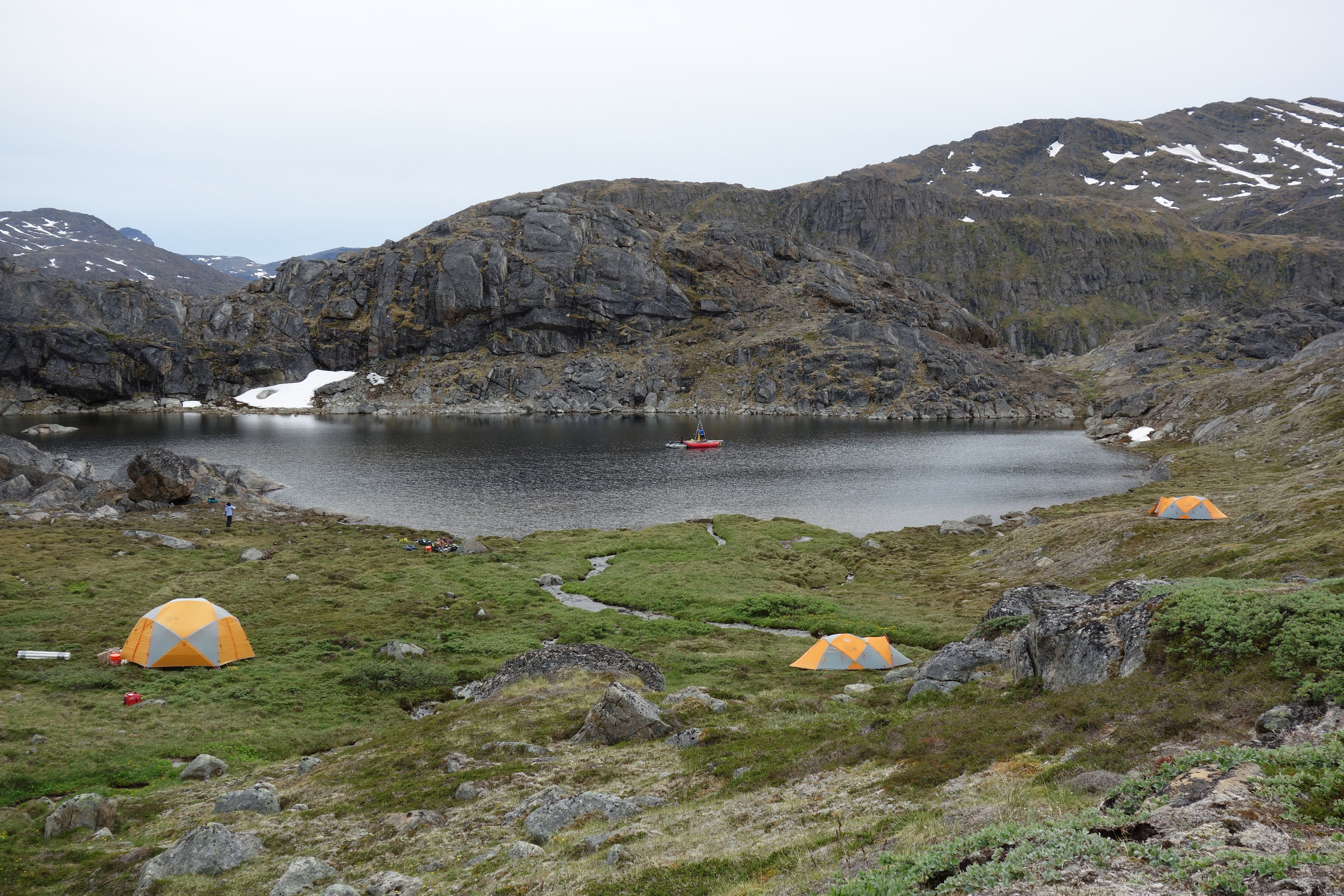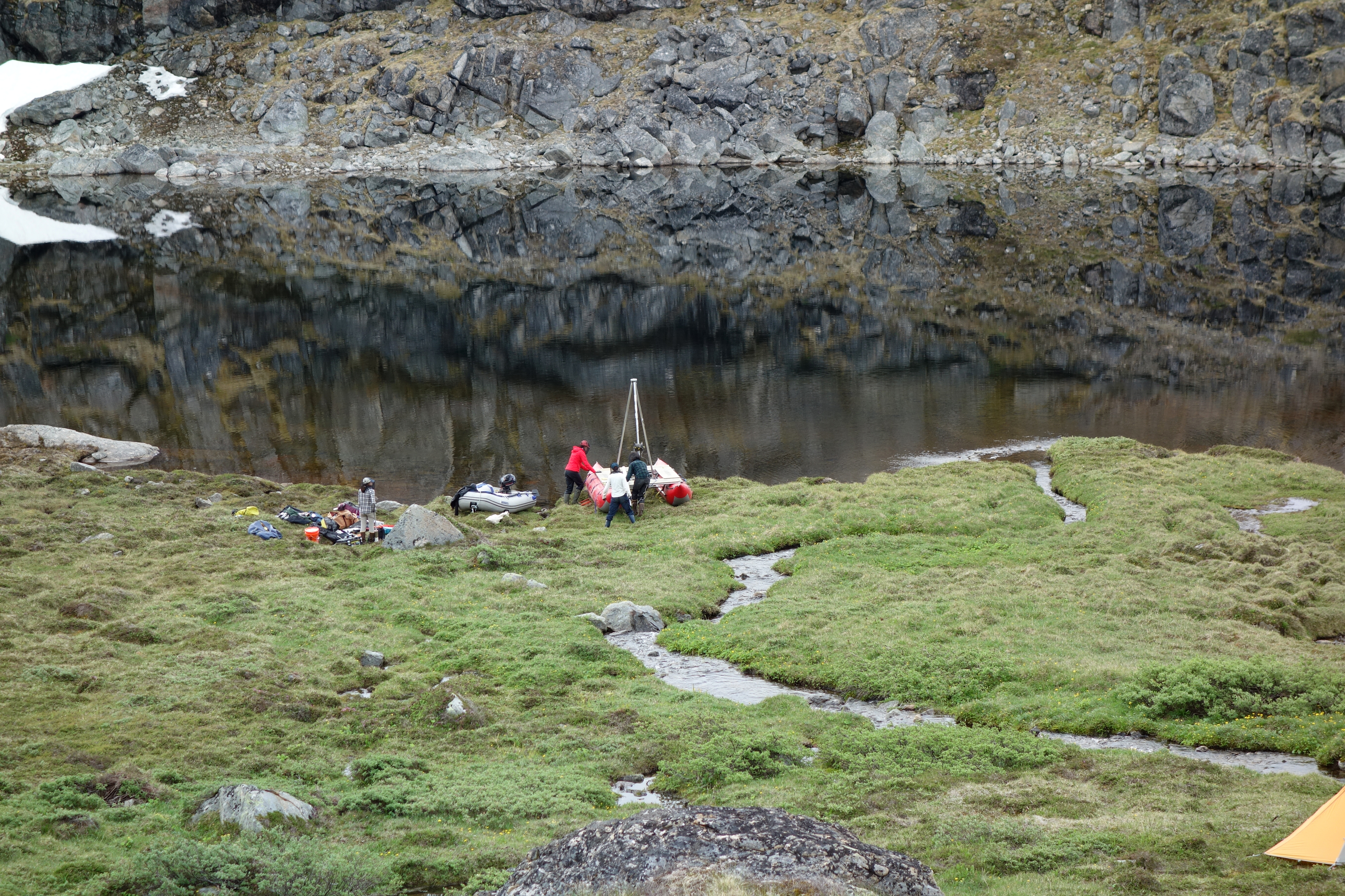 The research team assembles their pontoon boat on the shore of an isolated lake in Greenland. Credit: Anna McKee