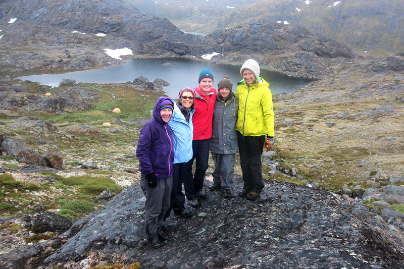 Artist Anna McKee (second from left in back, in purple) joined a UB-led research trip to Greenland in July 2018. The Arctic expedition was headed by Elizabeth Thomas, UB assistant professor of geology (far left). Others on the trip included UB students Kayla Hollister (front), Meg Corcoran (back, in red) and Allison Cluett (back, next to Corcoran); and Margie Turrin, education coordinator for Columbia University’s Lamont-Doherty Earth Observatory (far right). Credit: Elizabeth Thomas