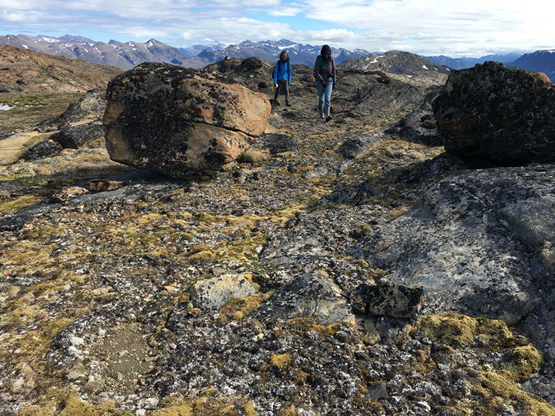 UB undergraduate student Kayla Hollister collects a sample of rock from Greenland. The chemical content of such boulder samples can provide clues about when glaciers may have disappeared in a region. Credit: Elizabeth Thomas