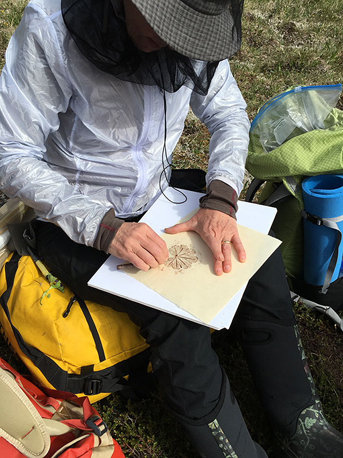 Artist Anna McKee in Greenland, completing a rubbing of an Arctic plant. Toward the end of the trip, McKee showed the scientists how to make their own rubbings — souvenirs from a productive research expedition. Credit: Eliabeth Thomas