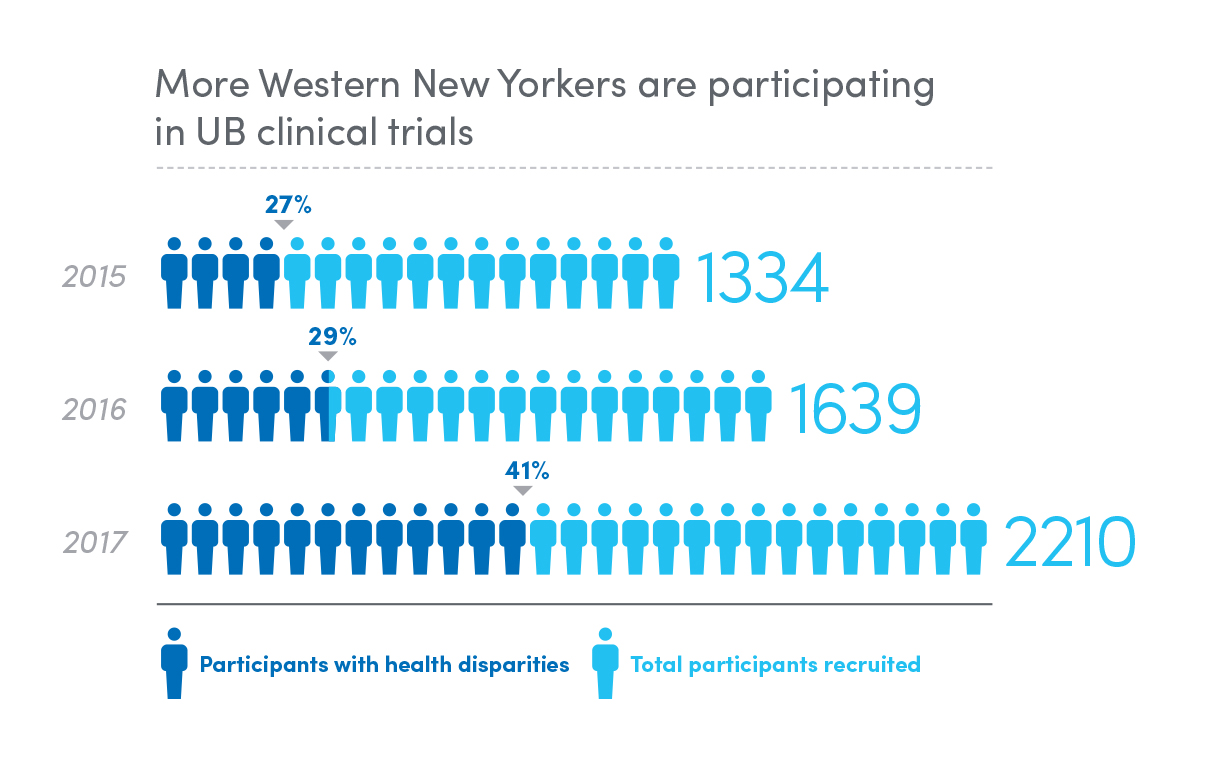 UB continues to work to make its clinical trials more inclusive and representative of the region’s diverse population. The number of participants in UB clinical trials who experience health disparities has increased from 27 percent in 2015 to 41 percent in 2017. Recruitment is focused on populations in the city and close to the Jacobs School’s new downtown location, home to largely underrepresented groups.