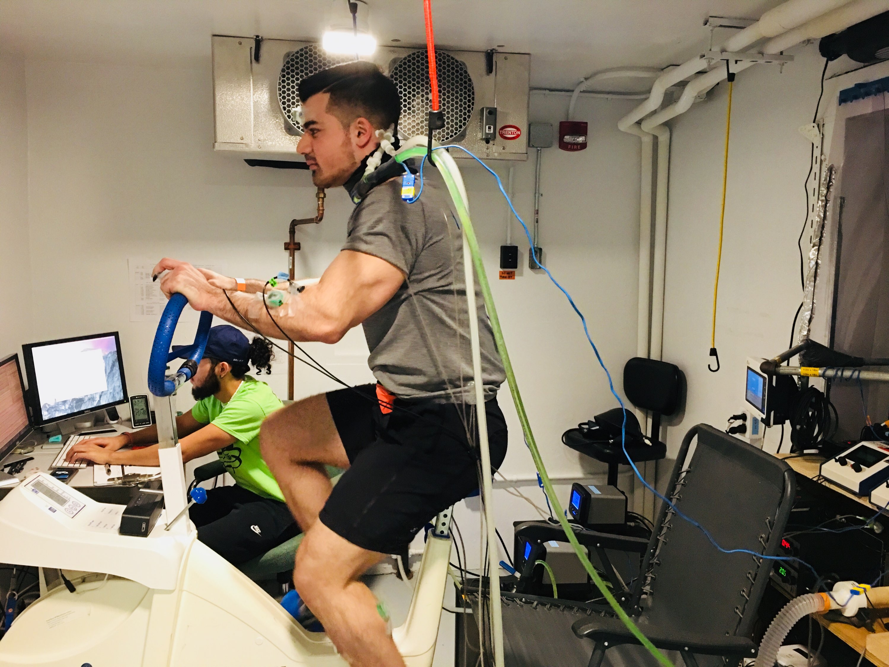 The study took place in UB’s Center for Research and Education in Special Environments. Researchers had 10 men and 10 women in their early 20s exercise at low intensity — about 65 revolutions per minute — on a stationary bicycle for one hour while watching a nature documentary. Each participant was equipped with a custom-made device: a dual tubing system that was in direct contact with the back of their neck.