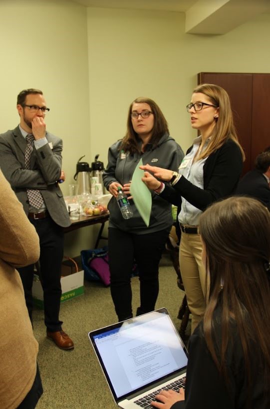 UB student and Chautauqua County native Kelly Mosher (standing, right) meets with Chautauqua County Senior Planner and UB alumnus Patrick Gooch (far left) and Katelyn Walley-Stoll, agriculture program community educator for the Cornell Cooperative Extension Chautauqua County.