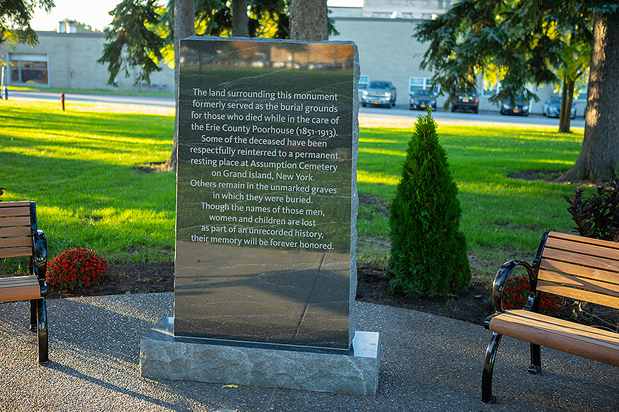 The land surrounding this monument formerly served as the burial grounds for those who died while in the care of the Erie County Poorhouse (1851-1913). Some of the deceased have been respectfully reinterred to a permanent resting place at Assumption Cemetery on Grand Island, New York. Others remain in the unmarked graves in which they were buried. Though the names of those men, women and children are lost as part of an unrecorded history, the spirit of their identity and the dignity of their memory will be forever honored.