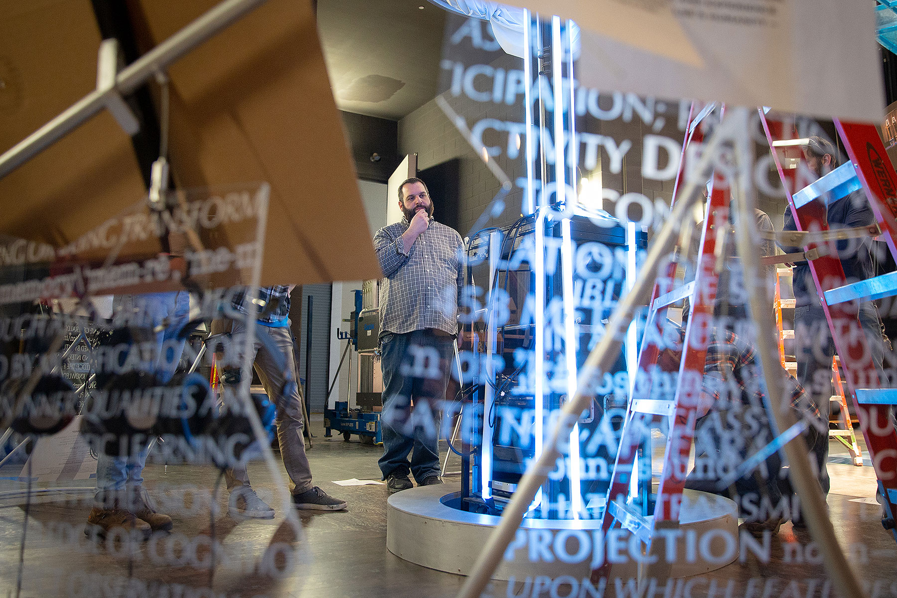 Jonathan Shimon, technical director, stands back and considers one of UB's cutting-edge multimedia exhibits for the Prague Quadrennial. Photos: Meredith Forrest Kulwicki