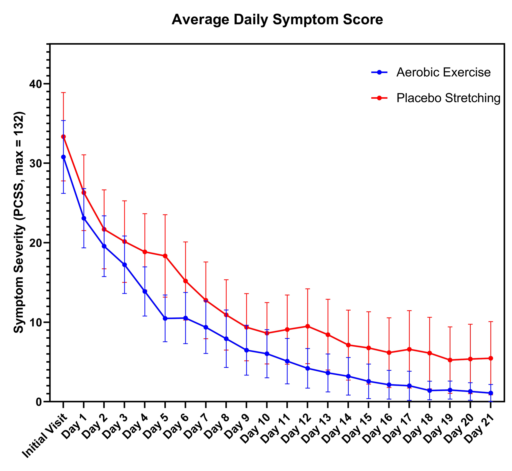Graph of research results showing that aerobic exercise helped reduce daily concussions symptoms in adolescent patients.