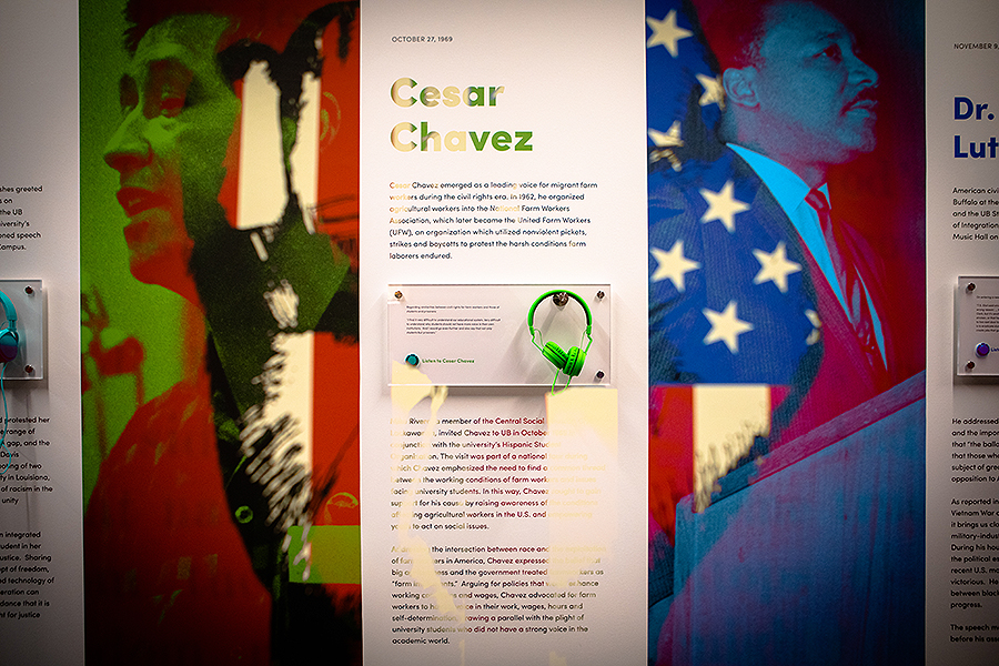The exhibit will feature a 24 feet by 4 feet structure in the Silverman Library on the North Campus that showcases five transcendent leaders who visited UB: Martin Luther King Jr., Malcolm X, Angela Davis, Shirley Chisholm and Cesar Chavez. The wall will also feature audio recordings of speakers and a timeline of events occurring throughout Buffalo and across the nation during the civil rights movement.