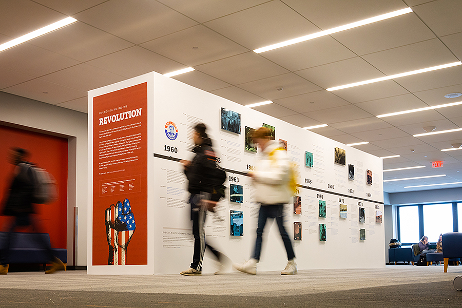 This section of the "Revolution" exhibit in the Silverman Library features a timeline of events occurring throughout Buffalo and across the nation during the civil rights movement. Photo: Douglas Levere