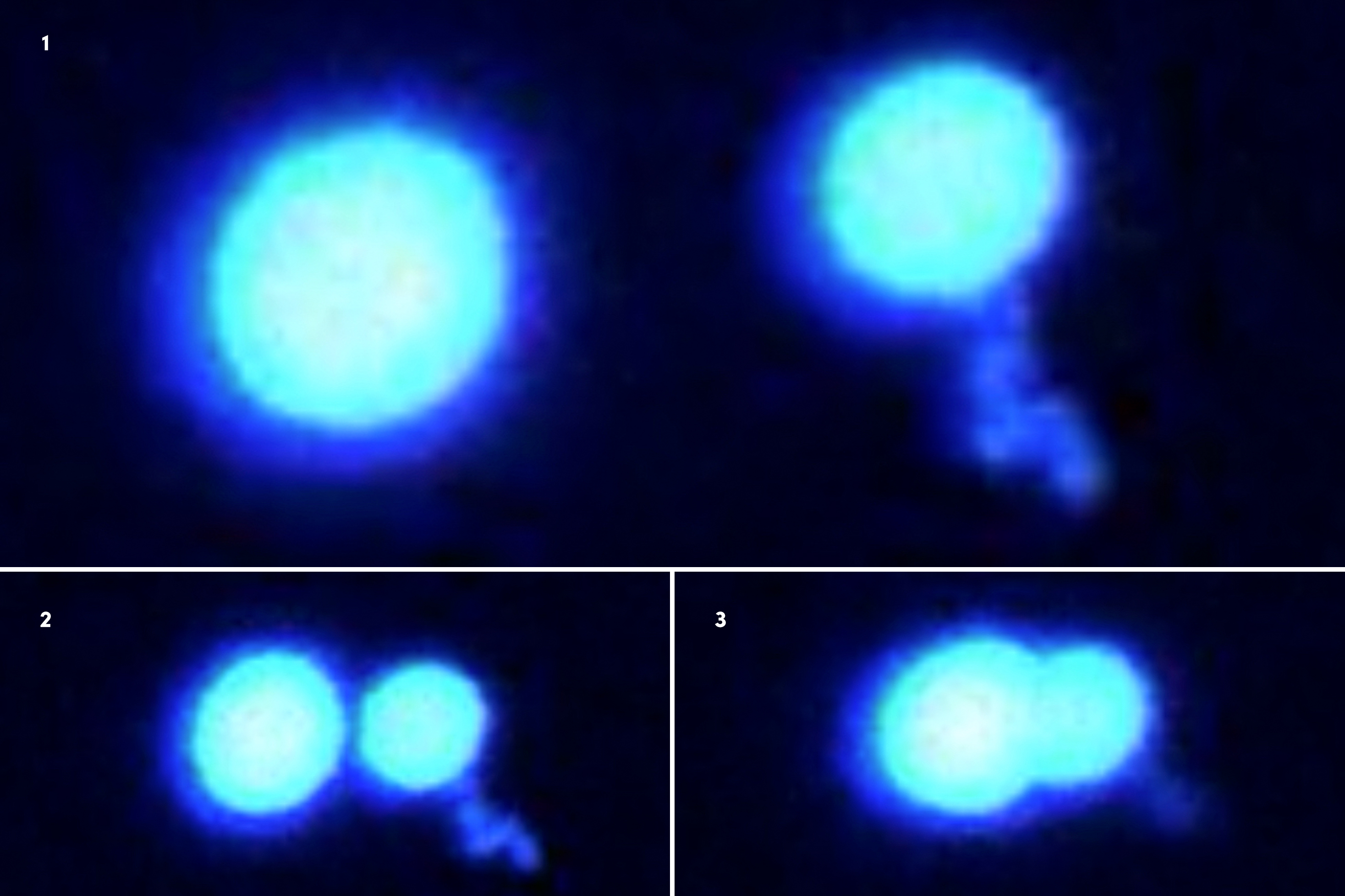 Two protein droplets refuse to merge when pushed together (fluorescence microscope images 1-3, shown sequentially). The droplets, made from fused in sarcoma proteins, are in a hard, gel-like state as they sit in a solution crowded with other molecules. Scientists used state-of-the-art optical tweezing technology to grab and manipulate these protein micro-droplets. Credit: Priya Banerjee Lab at UB