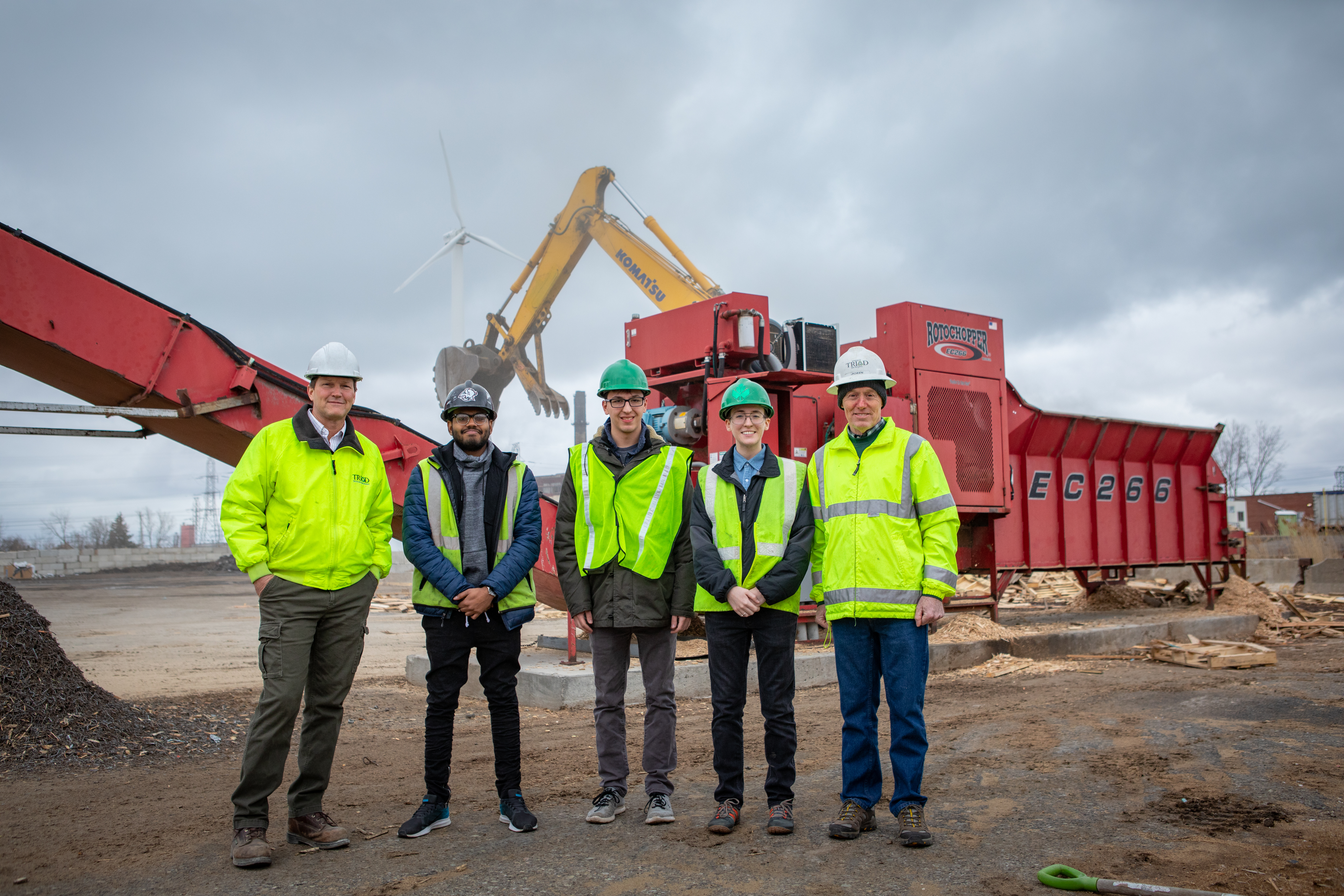 At Triad Recycling and Energy in the Town of Tonawanda, unwanted wood is ground for wood biomass recycling markets as one of the company’s two wind turbines turns in the background, producing energy. The business posed a challenge to students because it’s already so green. Credit: Douglas Levere / University at Buffalo