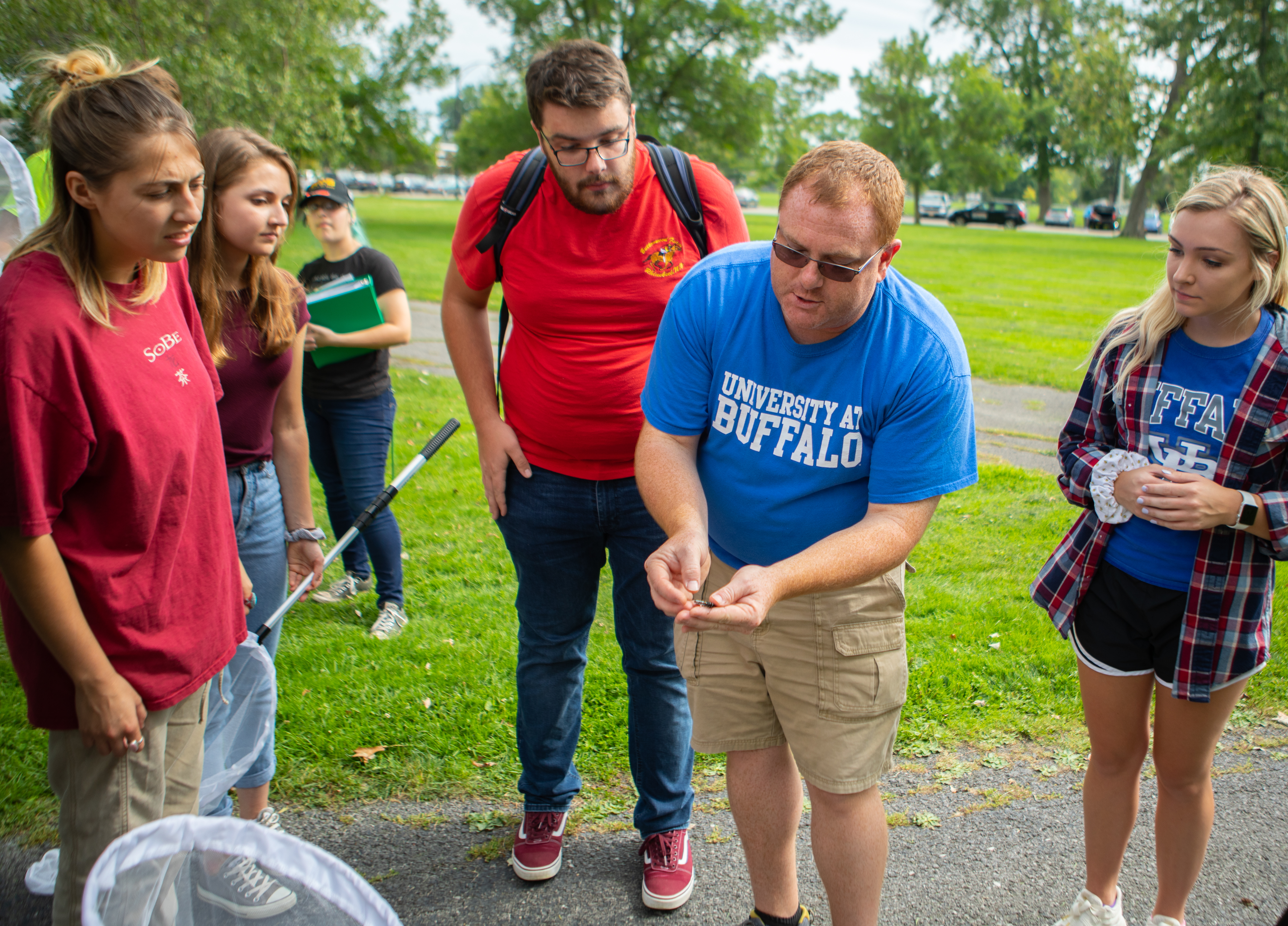 Nicholas Henshue (center, blue shirt), clinical assistant professor in the UB Department of Environment and Sustainability, holds a monarch butterfly as UB students look on. Credit: Douglas Levere / University at Buffalo