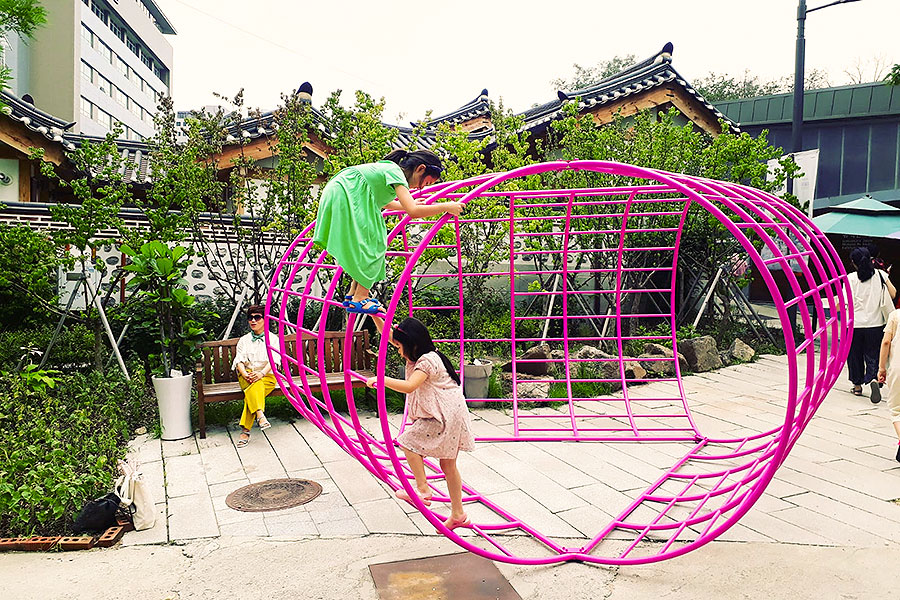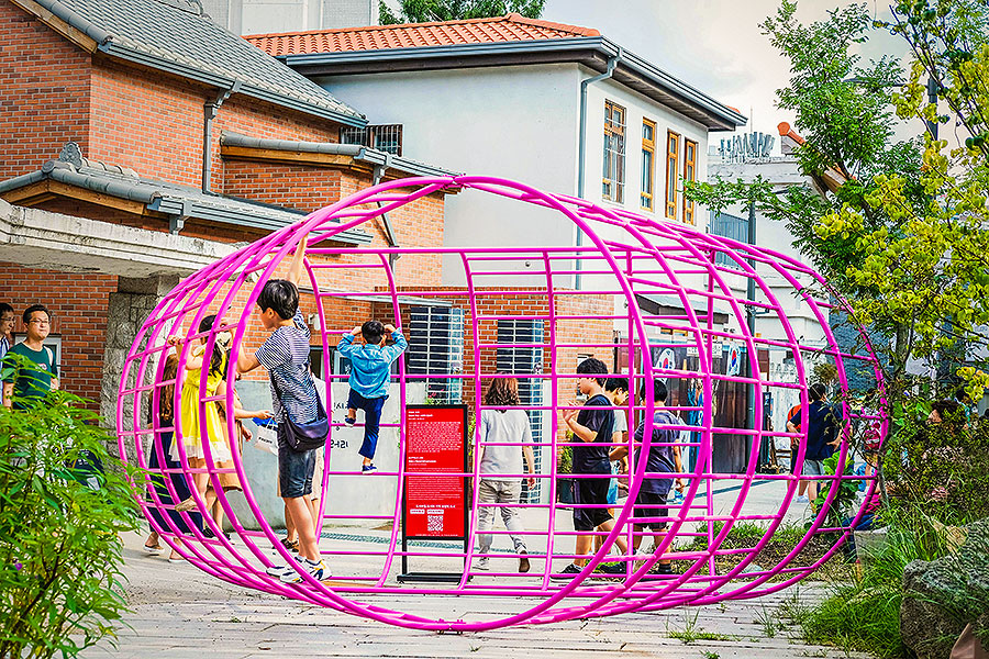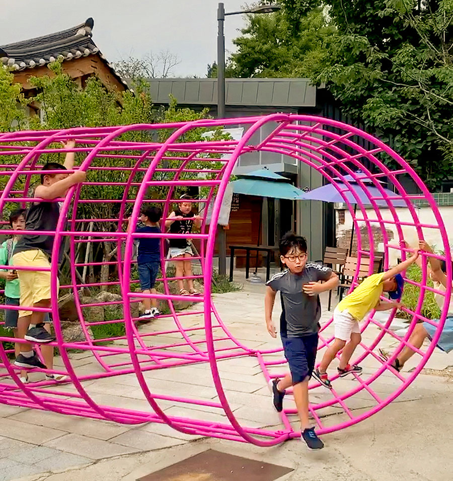 Measuring 14 feet by 16 feet by 8 feet, “Aldo” appropriates van Eyck’s signature climbing frame and reconfigures three of them to construct a striking magenta collective space, a sort of pavilion that visitors are encouraged to occupy and interact with by climbing, leaning and lounging in it and on it. The structure is on display in Donuimun Museum Village in Seoul.