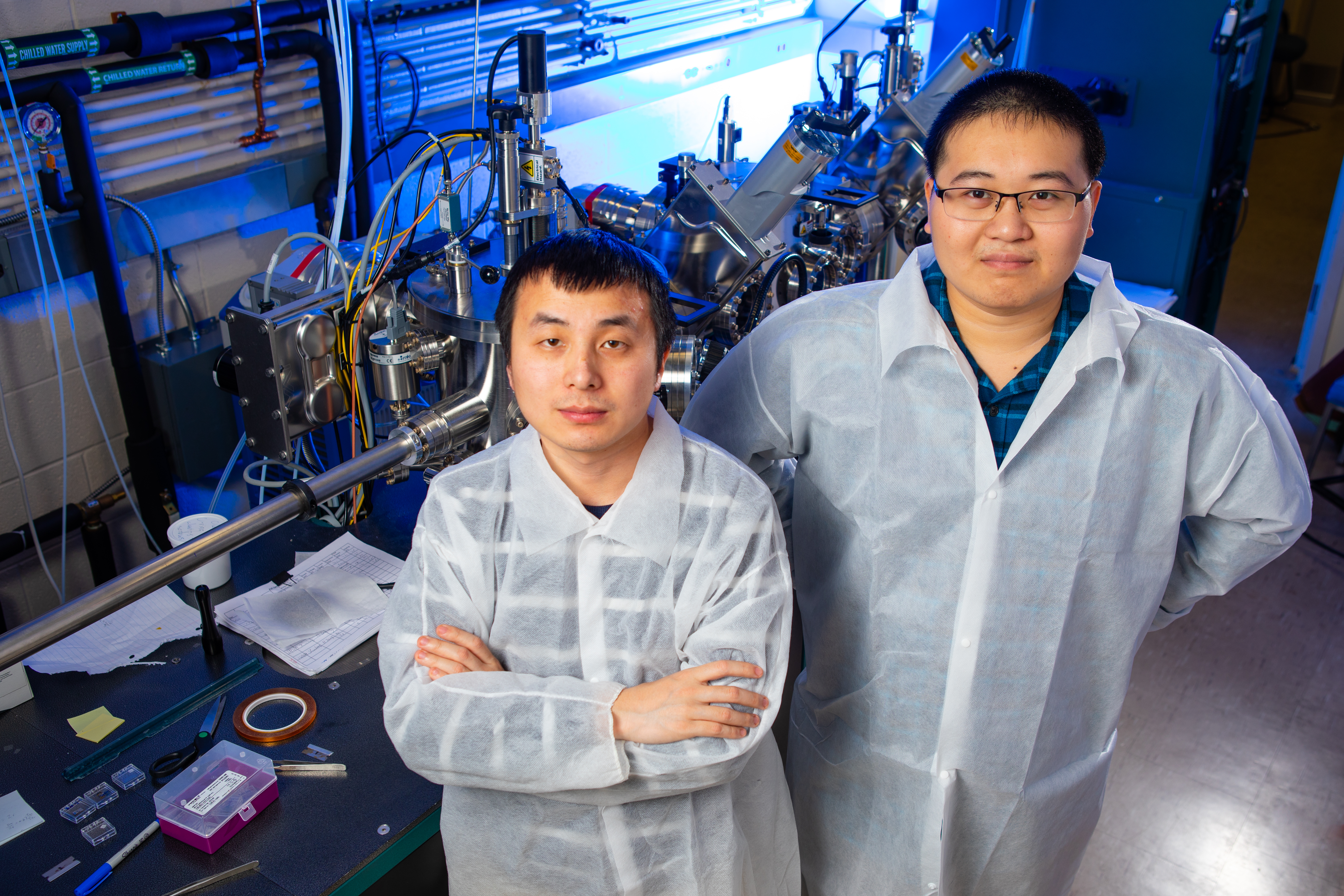 UB physics PhD students Xiucheng Wei (left) and Haolei Hui (right) were the first authors of a new study that reports on the creation of barium zirconium sulfide thin films. The research was led by UB physics professor Hao Zeng. Credit: Douglas Levere / University at Buffalo
